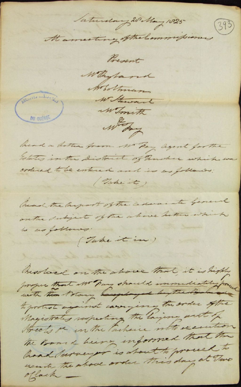 Brouillon d'un procès-verbal d'une réunion de la commission responsable de l'administration des biens des Jésuites, au sujet de l'aménagement de rues dans [La] Vacherie par les magistrats de Québec; au sujet des frais encourus par l'avocat général (George Vanfelson) pour services professionnels rendus; au sujet des comptes de [Lewis] Foy, en tant qu'agent responsable des biens des Jésuites pour le district de Québec, et par [Edme] Henry, agent responsable des biens des Jésuites pour la seigneurie de LaPrairie (Prairie-de-la-Madeleine), 28 mai 1825, Archives nationales à Québec, Fonds Ministère des Terres et Forêts, (03Q,E21,S64,SS5,SSS2,D393).