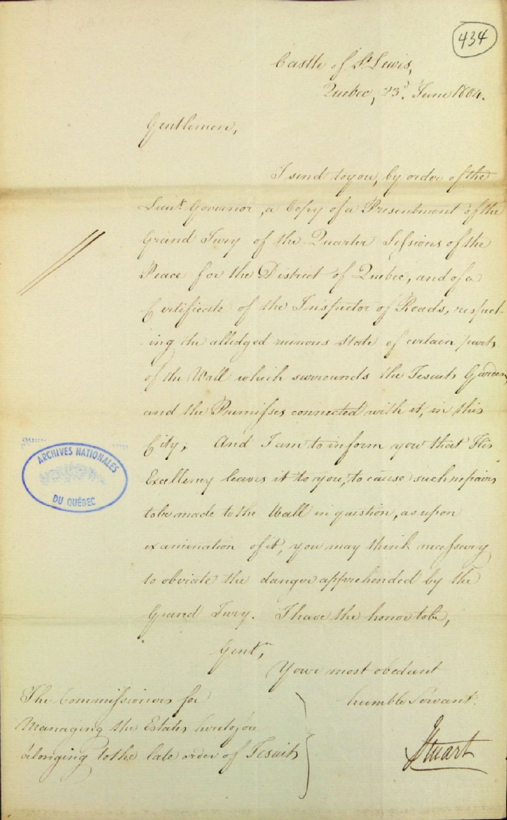 Lettre de James Stuart, secrétaire du lieutenant-gouverneur, aux commissaires responsables de l'administration des biens des Jésuites, au sujet du mauvais état de certains murs du jardin des Jésuites