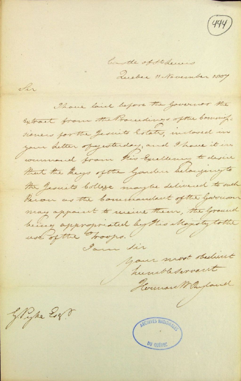 Lettre de Herman Witsius Ryland, secrétaire civil du gouverneur, à George Pyke, secrétaire de la commission responsable de l'administration des biens des Jésuites au sujet de la propriété du jardin des Jésuites, 11 novembre 1807, Archives nationales à Québec, Fonds Ministère des Terres et Forêts, (03Q,E21,S64,SS5,SSS2,D444).