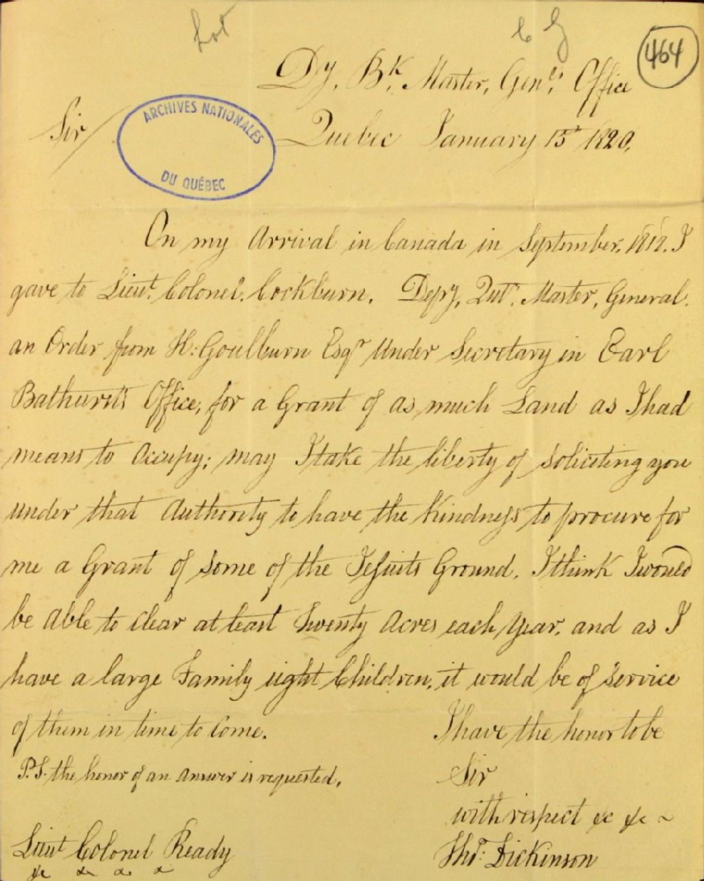 - Dans cette lettre, T. Dickinson informe J. Ready qu'il est arrivé au Canada en septembre 1818, avec un ordre de Henry Goulburn, sous-secrétaire d'État aux Colonies, à donner à Francis Cockburn, sous-quartier-maître général du Haut et du Bas-Canada, pour qu'il reçoive autant de terre qu'il peut en occuper. Conséquemment, il indique à J. Ready qu'il devrait pouvoir défrichir, en sa qualité de père de huit enfants, 20 acres à chaque année, si on lui donne une concession sur les terres des Jésuites (DBC)