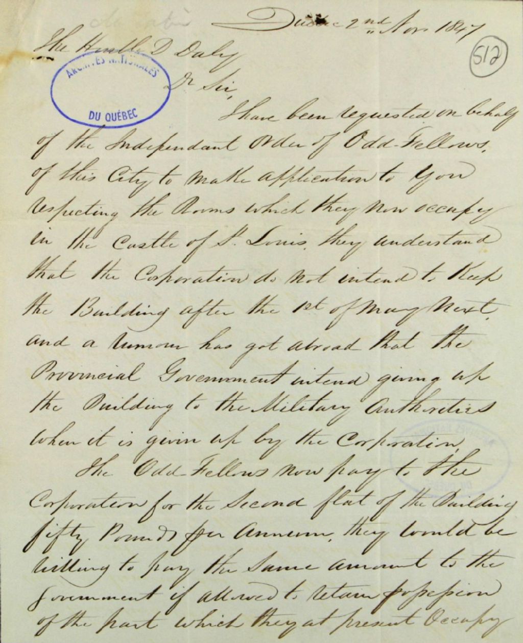 - Lettre de George Hall, au nom de l'«Independant Order of Odd Fellows», à Dominick Daly, secrétaire du Canada Est et Ouest, au sujet de la propriété future du château Saint-Louis