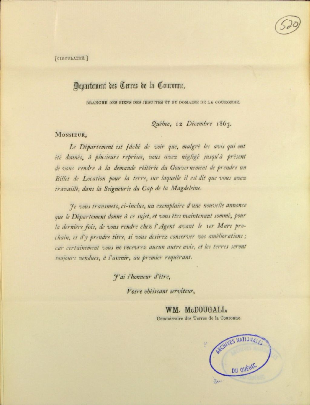 Circulaire du département des Terres de la Couronne, direction des biens des Jésuites et du domaine de la Couronne, écrite par [William] McDougall, commissaire des Terres de la Couronne, sommant, pour la dernière fois, de se rendre chez l'agent de la la seigneurie du Cap de la Magdeleine (Cap-de-la-Madeleine) et d'y prendre titre, avant le 1er mars, 12 décembre 1863, Archives nationales à Québec, Fonds Ministère des Terres et Forêts, (03Q,E21,S64,SS5,SSS2,D520).