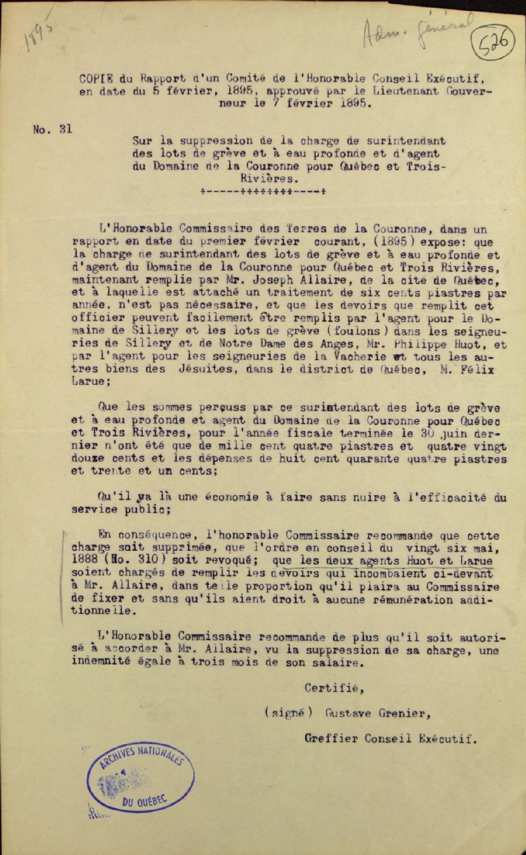 Copie d'un rapport d'un comité de l'honorable Conseil exécutif en date du 5 février 1895, approuvé par le Lieutenant-gouverneur, le 7 février 1895, sur la suppression de la charge de surintendant des lots de grève et eau profonde et d'agent du Domaine de la Couronne pour Québec et Trois-Rivières, 6 mars 1895, Archives nationales à Québec, Fonds Ministère des Terres et Forêts, (03Q,E21,S64,SS5,SSS2,D526).