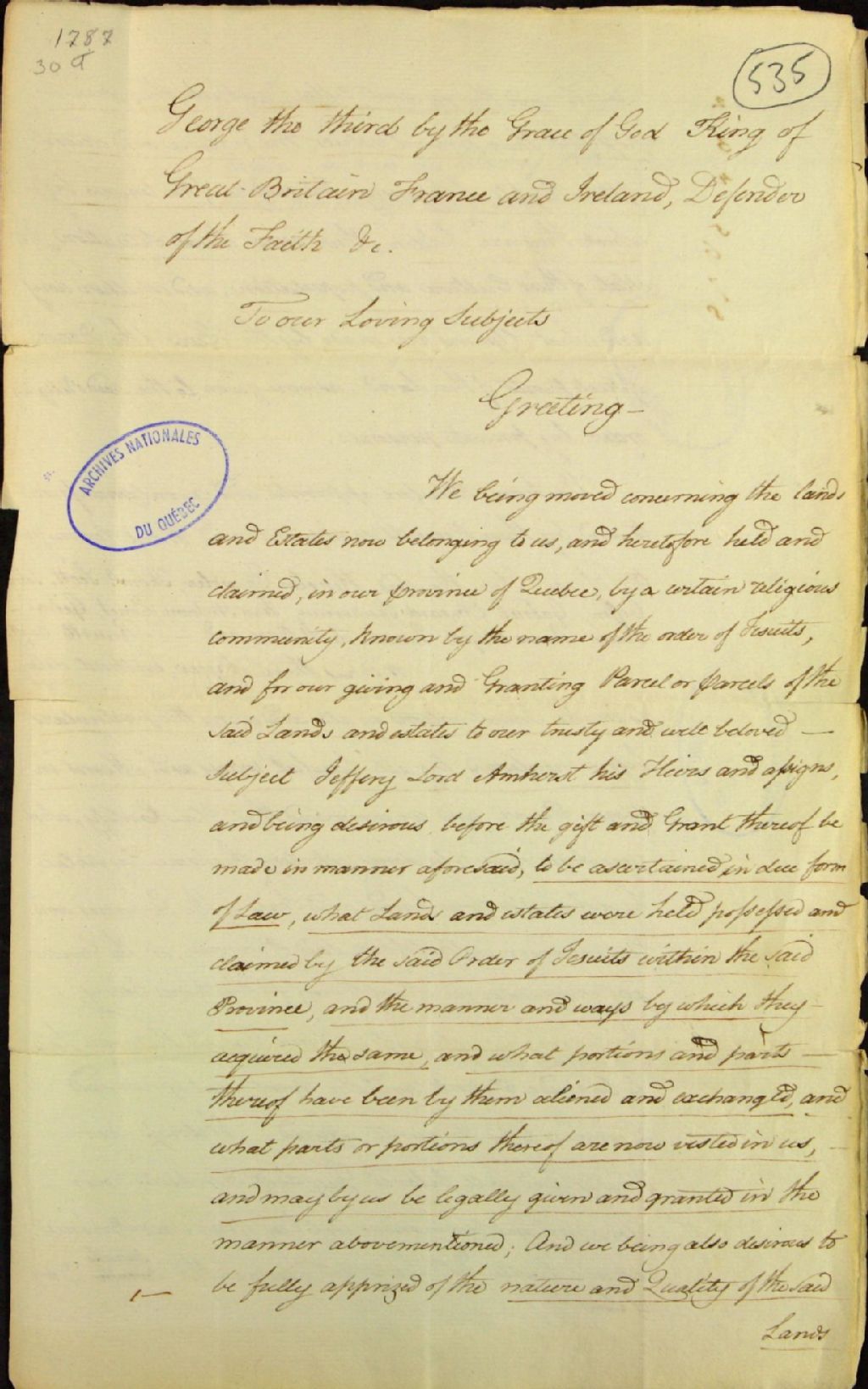 Projet de lettre patente pour la commission chargée d'enquêter sur les biens des Jésuites, constituée selon l'ordre du Roi en conseil, le 18 août 1786 et lu devant le Conseil exécutif de la province de Québec, le 30 octobre 1787