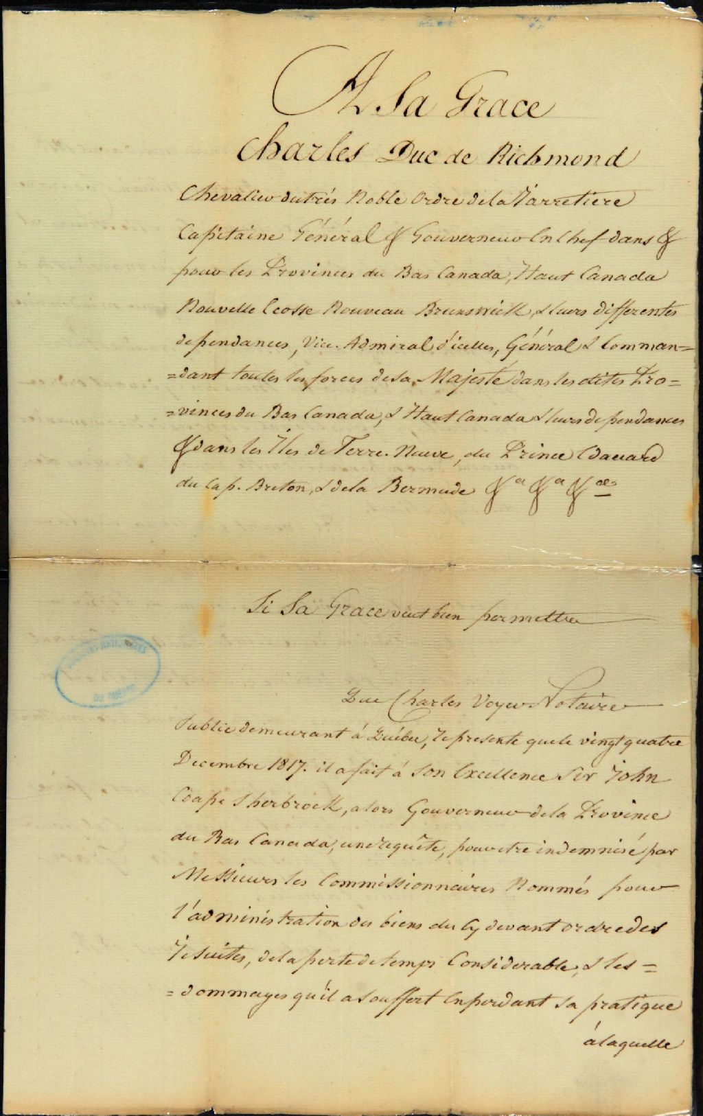 Requête de Charles Voyer, notaire public de Québec, à Charles [Lennox], duc de Richmond [et Lennox] et gouverneur, demandant une indemnisation pour le temps qu'il a consacré à l'indemnisation d'un papier-terrier concernant les biens des Jésuites, 20 août 1818, Archives nationales à Québec, Fonds Ministère des Terres et Forêts, (03Q,E21,S64,SS5,SSS2,D549).