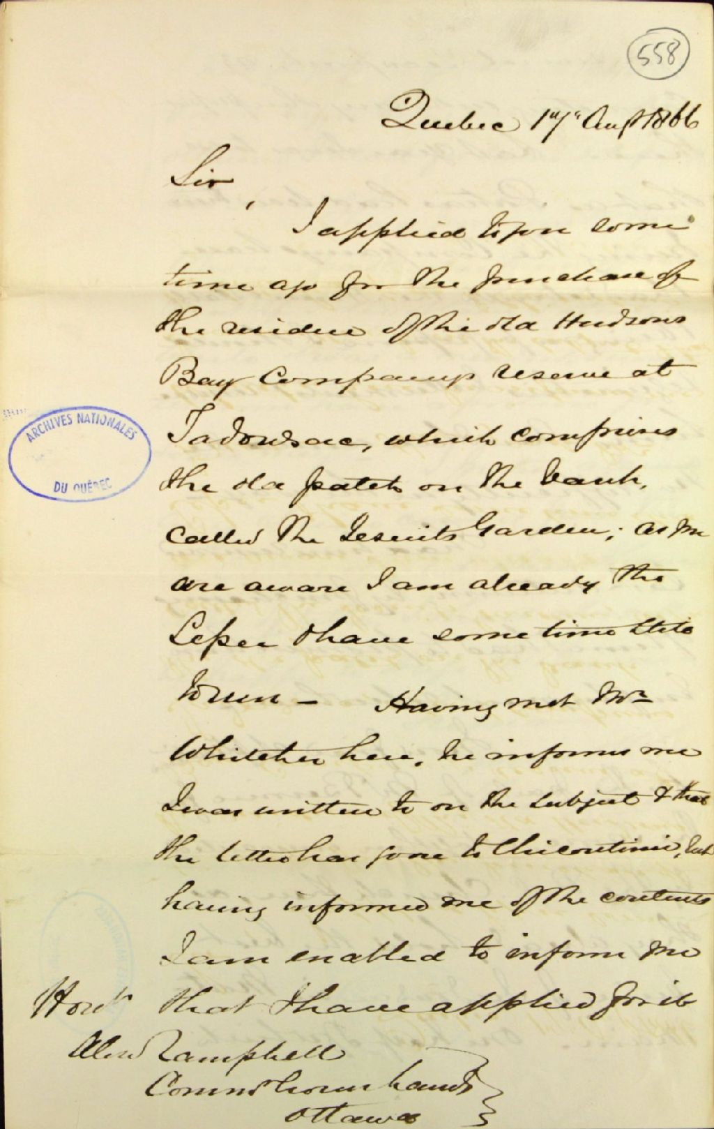 Lettre de David [Edward ] Price, marchand de bois conseiller législatif des Laurentides, à Alexender Campbell, commissaire des Terres de la Couronne, au sujet de la construction d'une église catholique romaine sur le lieu connu sous le nom de jardin des Jésuites (ancienne réserve de la Compagnie de la Baie d'Hudson), à Tadoussac