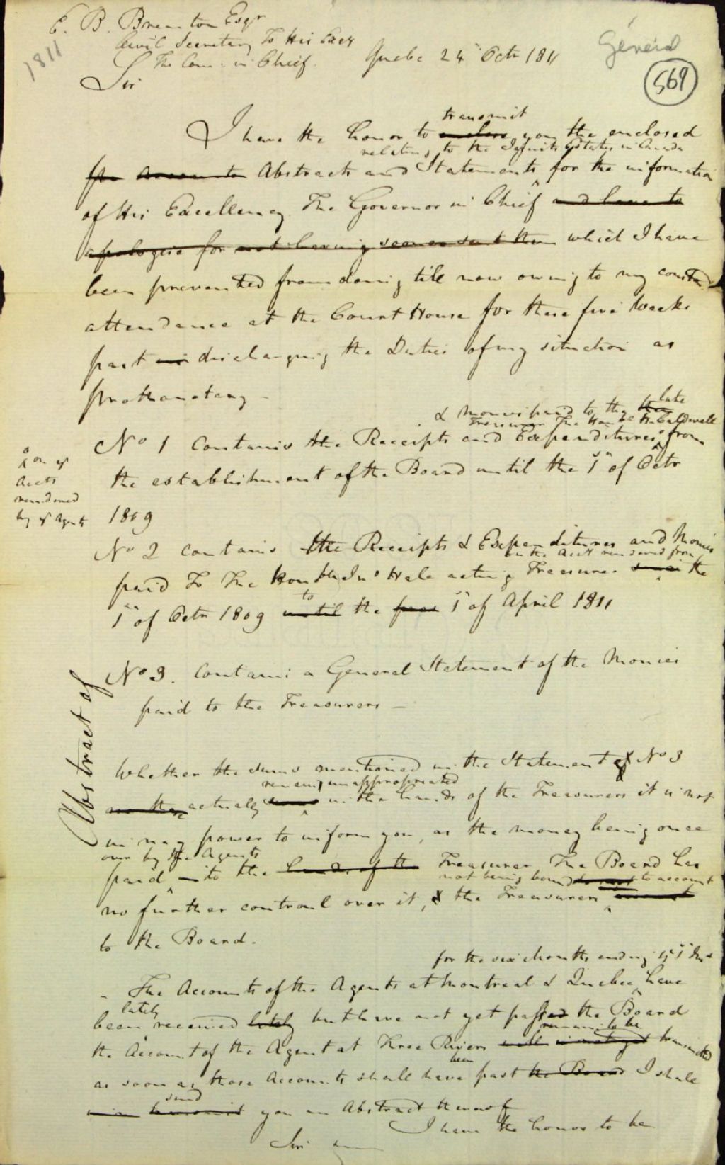 Résumé des comptes relatifs aux biens des Jésuites, envoyé au secrétaire civil du gouverneur en chef (George Herman Ryland), 24 octobre 1811, Archives nationales à Québec, Fonds Ministère des Terres et Forêts, (03Q,E21,S64,SS5,SSS2,D569).