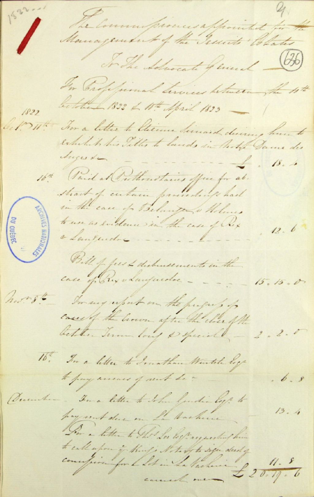 Compte relatif aux services professionnels rendus à la commission responsable de l'administration des biens des Jésuites, entre le 11 octobre 1822 et le 11 mars 1823, par George Vanfelson, avocat général du Bas-Canada, 10 avril 1823, Archives nationales à Québec, Fonds Ministère des Terres et Forêts, (03Q,E21,S64,SS5,SSS2,D636).