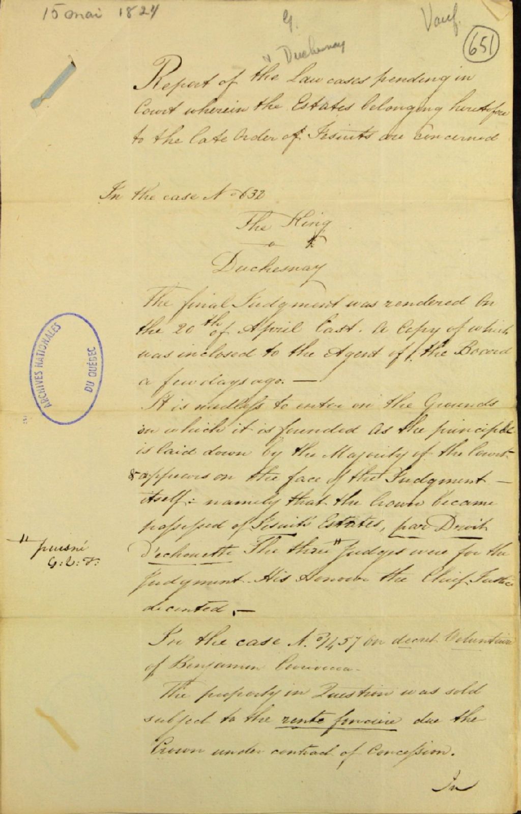 Rapport de [George] Vanfelson, avocat général, au sujet de l'avancement de diverses causes judiciaires concernant la commission responsable de l'administration des biens des Jésuites, 15 mai 1824, Archives nationales à Québec, Fonds Ministère des Terres et Forêts, (03Q,E21,S64,SS5,SSS2,D651).
