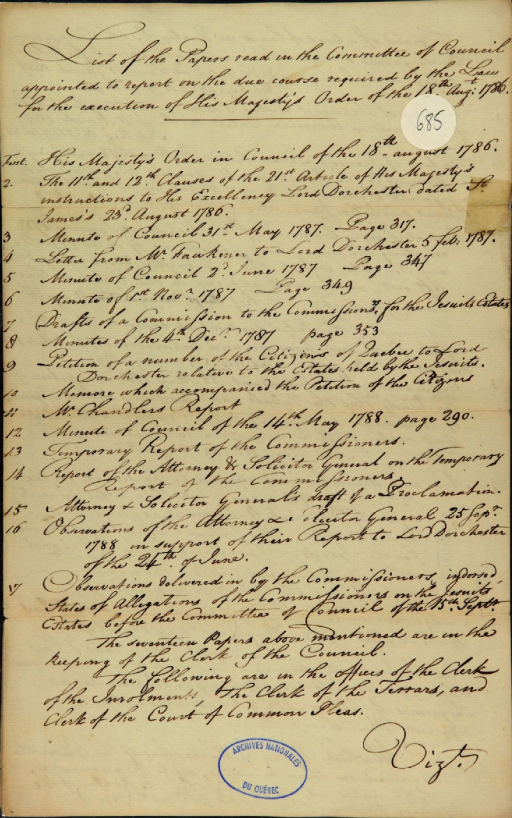 Liste des documents lus devant le comité mis en place pour adopter une méthode pour amener à exécution l'ordre en Conseil de Sa Majesté (18 août 1786) en faveur de Lord Amherst (Jeffery, 1er baron d'Amherst; Jeffery Amherst), concernant une concession réclamée à même les biens des Jésuites, 1er janvier 1788 - 31 décembre 1788, Archives nationales à Québec, Fonds Ministère des Terres et Forêts, (03Q,E21,S64,SS5,SSS2,D685).