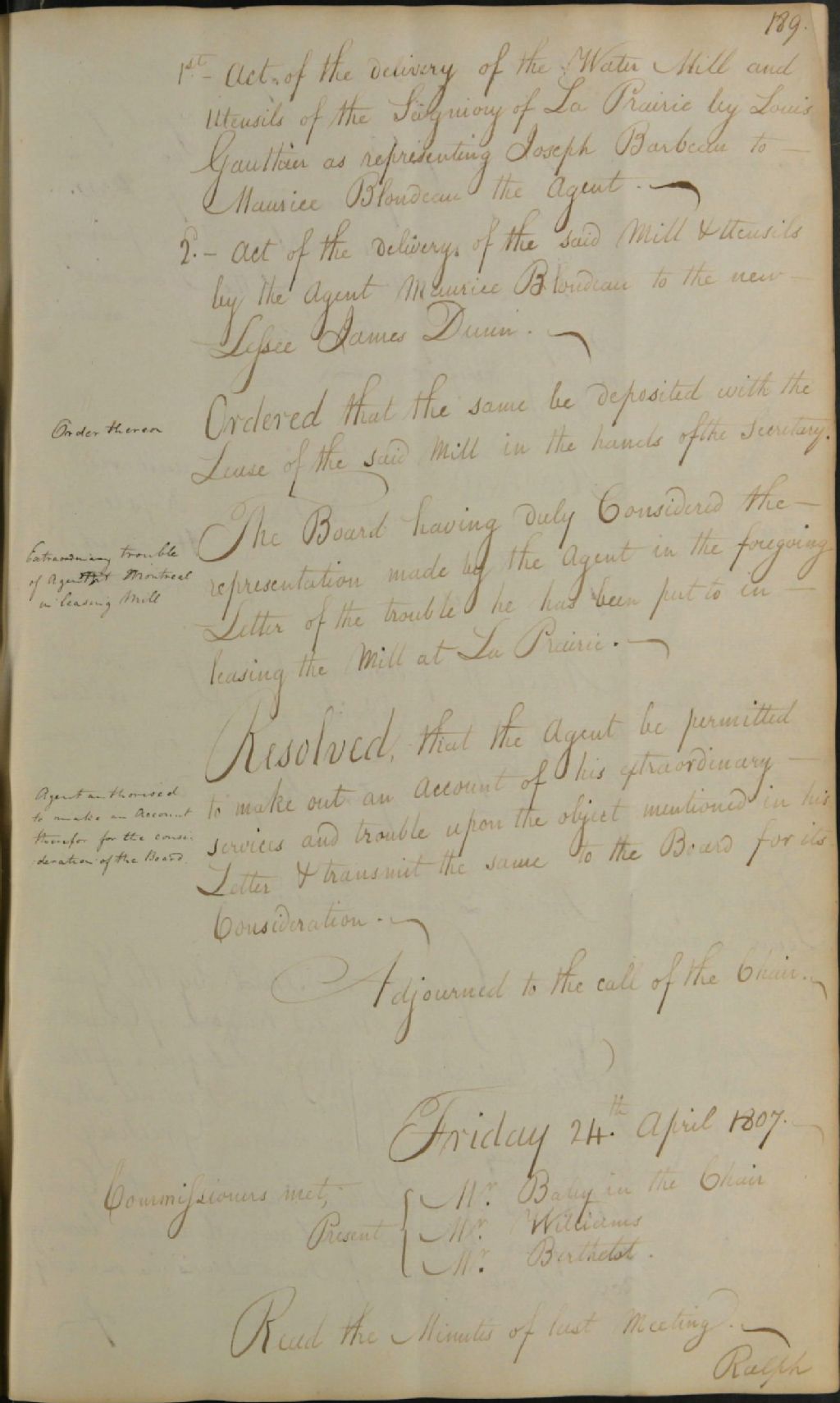 Procès-verbal d'une réunion de la commission responsable de l'administration des biens des Jésuites, au sujet des réparations à effectuer sur le domaine de Beauport; où la lettre patente désignant Herman Witsius Ryland comme commissaire responsable de l'administration des biens des Jésuites à la place de Nathaniel Taylor; au sujet de la construction d'un nouveau moulin à Cape Magdelaine (Cap-de-la-Madeleine); au sujet des personnes refusant de payer leurs rentes dans le district de Québec; au sujet du mauvais état de l'église jésuite adjacente aux «Jesuits Barracks» (collège des Jésuites de Québec, transformé en caserne), 24 avril 1807, Archives nationales à Québec, Fonds Ministère des Terres et Forêts, (03Q,E21,S64,SS5,SSS2,D690-107).