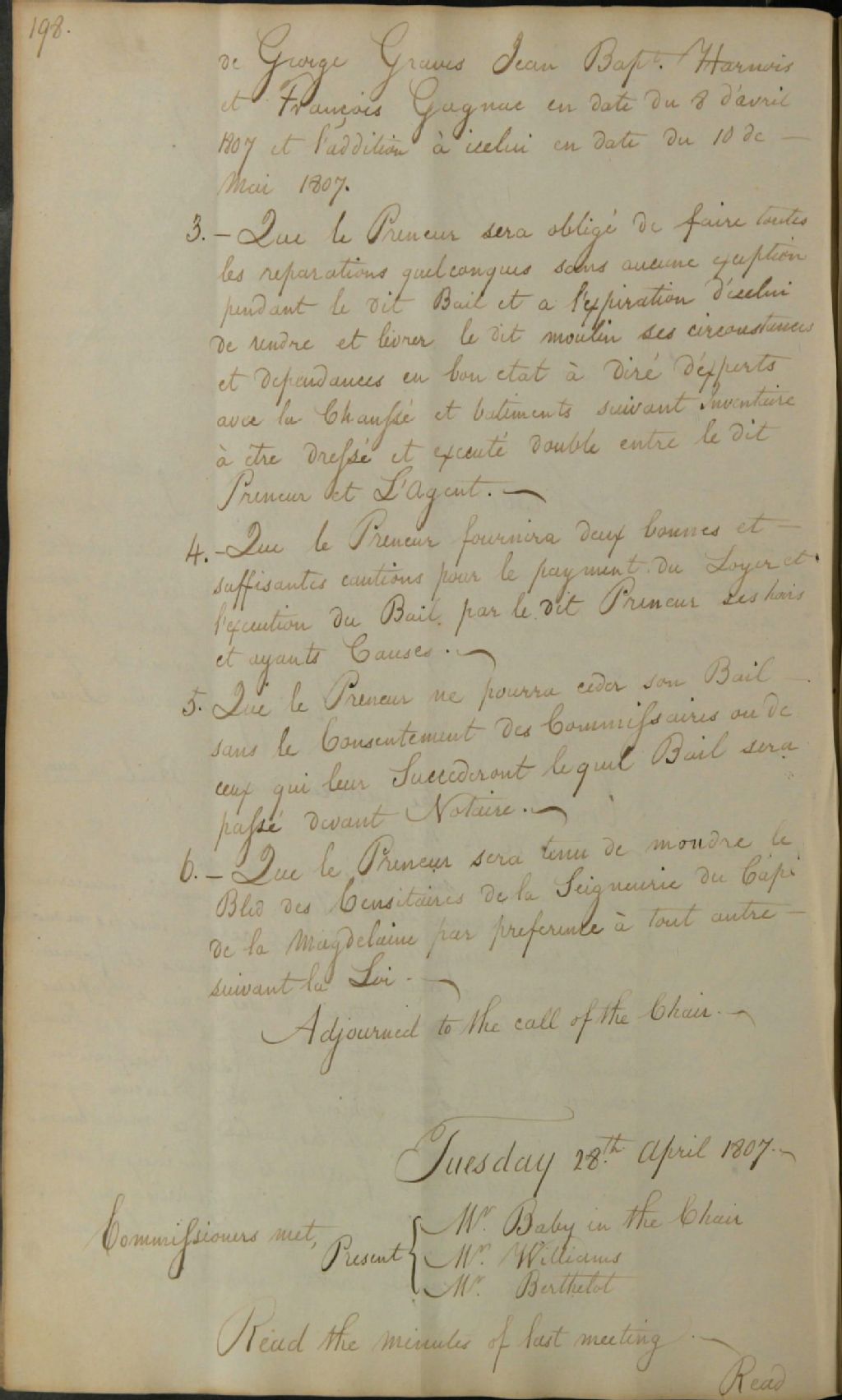 Procès-verbal d'une réunion de la commission responsable de l'administration des biens des Jésuites, au sujet du rapport de Charles Jourdain et René Laflèche sur l'état de délabrement de l'église jésuite adjacente aux «Jesuits Barracks» (collège des Jésuites de Québec, transformé en caserne); au sujet de l'occupation du jardin des Jésuites par les soldats; au sujet du mur du moulin de Cape Magdelaine (Cap-de-la-Madeleine); au sujet de l'état du mur du jardin des Jésuites donnant sur la rue Sainte-Anne, 28 avril 1807, Archives nationales à Québec, Fonds Ministère des Terres et Forêts, (03Q,E21,S64,SS5,SSS2,D690-109).