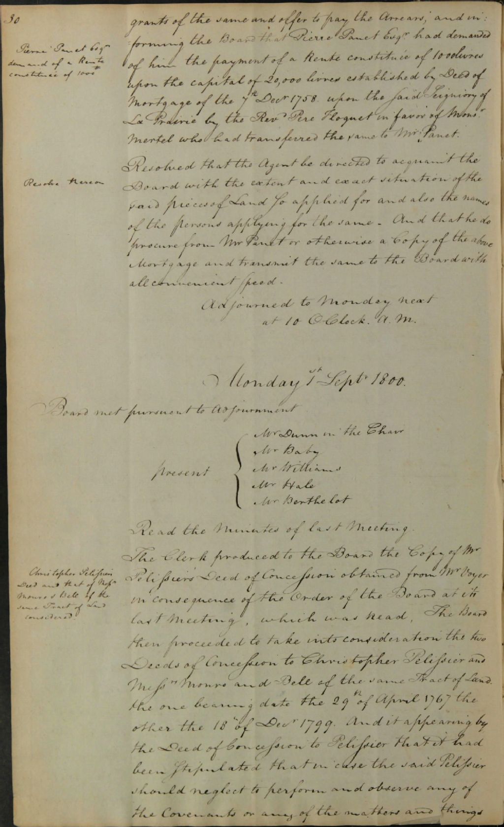 Procès-verbal d'une réunion de la commission responsable de l'administration des biens des Jésuites, au sujet d'une terre concédée à [David] Monro et [Mathew] Bell par les Jésuites en 1799; au sujet de la transmission de la liste des documents ayant appartenus aux Jésuites et conservés dans deux coffres à l'agent responsable des biens des Jésuites pour le district de Québec (Michel Berthelot); au sujet du loyer de la commission; au sujet des requêtes de John Gibbard, James Bell et Patrick Peakin, réclamant la location de moulins situés sur les biens des Jésuites, 1er septembre 1800, Archives nationales à Québec, Fonds Ministère des Terres et Forêts, (03Q,E21,S64,SS5,SSS2,D690-11).