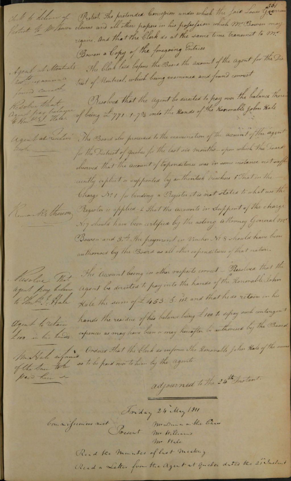 Procès-verbal d'une réunion de la commission responsable de l'administration des biens des Jésuites, au sujet des empiètements causés par la clôture de Roger Lelièvre sur la ferme de [La] Vacherie et des démarches légales qui sont entreprises à ce propos, 24 mai 1811, Archives nationales à Québec, Fonds Ministère des Terres et Forêts, (03Q,E21,S64,SS5,SSS2,D690-169).