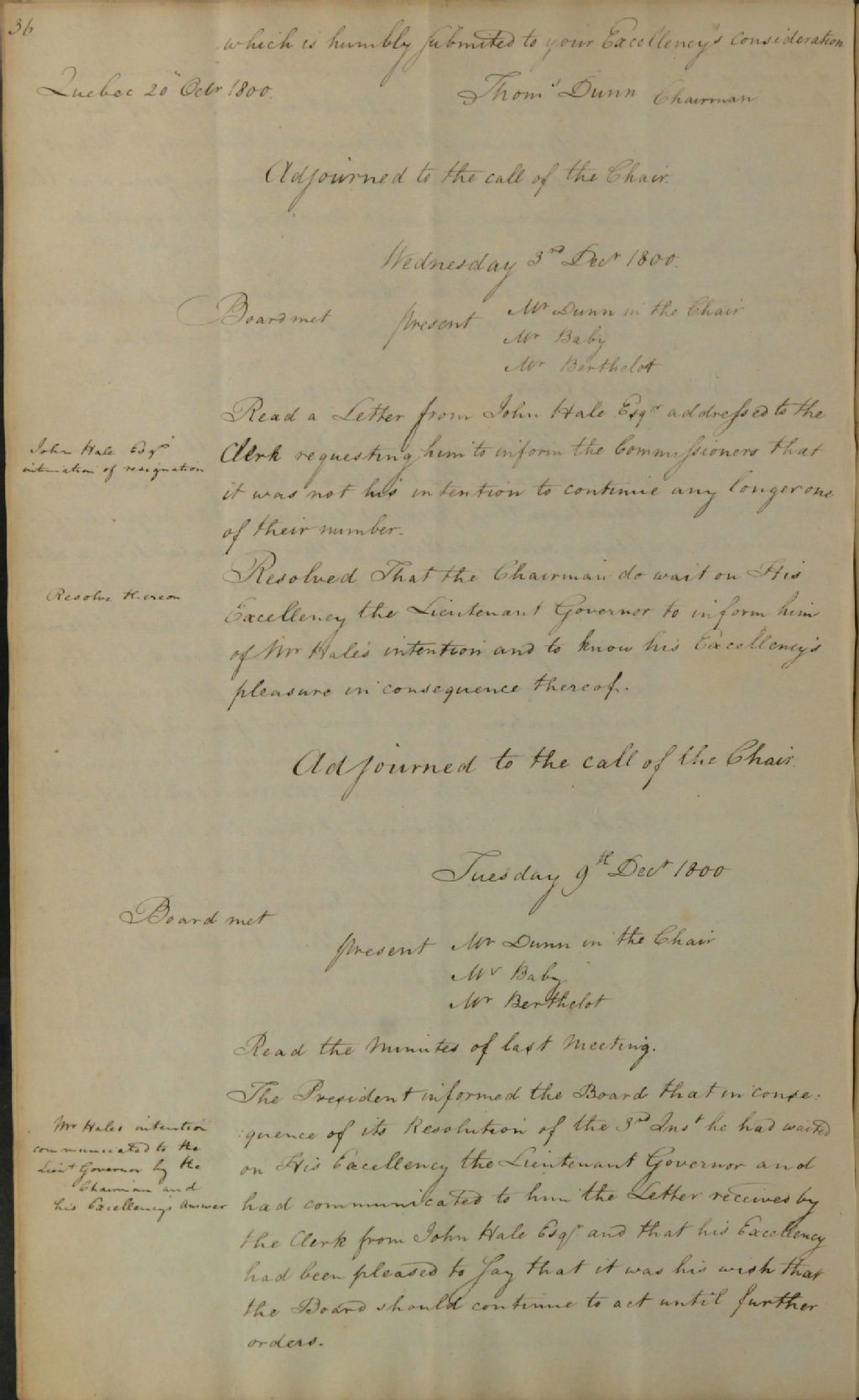 Procès-verbal d'une réunion de la commission responsable de l'administration des biens des Jésuites, au sujet de la démission de John Hale de son rôle de commissaire; au sujet du refus de certaines personnes de payer leurs rentes constituées dans la ville de Québec selon les termes de leur acte de concession; au sujet de la requête de Louis D'Arveau (Darveau), de Jean-Baptiste Bédard et de Jean-Baptiste Jolicour (Jolicoeur), marguilliers de l'église paroissiale de Saint-Ambroise; au sujet d'une requête de Pierre[-Louis] Panet concernant sa rente constituée; au sujet de l'attribution de terres non concédées et des arrérages dans la seigneurie de La Prairie de la Magdelaine (Prairie-de-la-Madeleine); au sujet de John Kowash; au sujet d'un plan de la seigneurie de la Prairie (Prairie-de-la-Madeleine); au sujet d'un site possible (la petite rivière de Montréal) pour l'érection d'un moulin; au sujet des intentions du lieutenant-gouverneur d'obtenir un rapport de ladite commission sur ses revenus; au sujet d'une requête de Louis Vincent; au sujet du papier-terrier de la seigneurie de Batiscan; au sujet du salaire du secrétaire de ladite commission (George Pyke), 9 décembre 1800, Archives nationales à Québec, Fonds Ministère des Terres et Forêts, (03Q,E21,S64,SS5,SSS2,D690-17).
