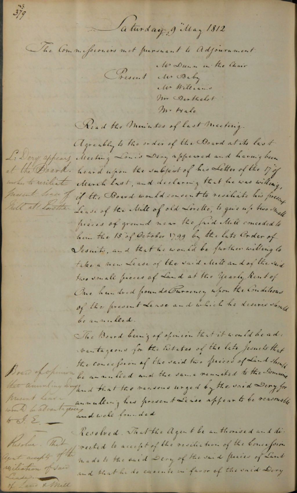 Procès-verbal d'une réunion de la commission responsable de l'administration des biens des Jésuites, au sujet de l'octroi d'un nouveau bail à Louis Déry sur le moulin de Old Lorette (L'Ancienne-Lorette); au sujet de l'abandon en faveur de ladite commission, par L. Déry, de deux pièces de terrain adjacentes audit moulin; au sujet du bail octroyé à Anthony Anderson sur la petite ferme située près du pont Dorchester; au sujet des frais encourus par Edward Bowen, procureur général intérimaire et ancien solliciteur de ladite commission, pour services professionnels rendus; au sujet des comptes de l'agent responsable des biens des Jésuites pour le district de Québec (Michel Berthelot), 9 mai 1812, Archives nationales à Québec, Fonds Ministère des Terres et Forêts, (03Q,E21,S64,SS5,SSS2,D690-181).