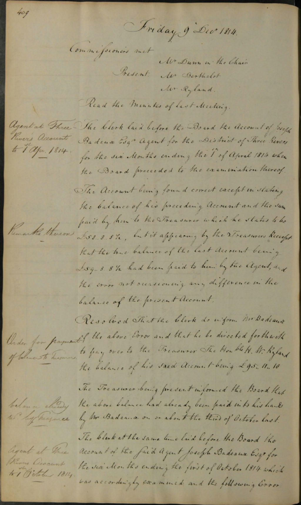 Procès-verbal d'une réunion de la commission responsable de l'administration des biens des Jésuites, au sujet des comptes de Joseph Badeaux, agent responsable des biens des Jésuites pour le district de Trois-Rivières (Joseph Badeaux); au sujet des comptes d'Edme Henri (Henry), agent responsable des biens des Jésuites pour le district de Montréal; au sujet des comptes de Michel Berthelot, agent responsable des biens des Jésuites pour le district de Québec; au sujet du salaire de George Pyke, secrétaire de ladite commission; au sujet de l'incendie de la maison liée à la ferme de Notre Dame des Anges (Notre-Dame-des-Anges); au sujet des arrérages de cens et rentes et de lots et ventes dûs à ladite commission, dans le district de Québec; au sujet de l'interdiction envoyée à Thomas Coffin de couper des arbres sur les terres non concédées de la seigneurie de Cape Magdelaine (Cap-de-la-Madeleine); au sujet des comptes du trésorier de ladite commission (Herman Witsius Ryland), 9 décembre 1814, Archives nationales à Québec, Fonds Ministère des Terres et Forêts, (03Q,E21,S64,SS5,SSS2,D690-191).