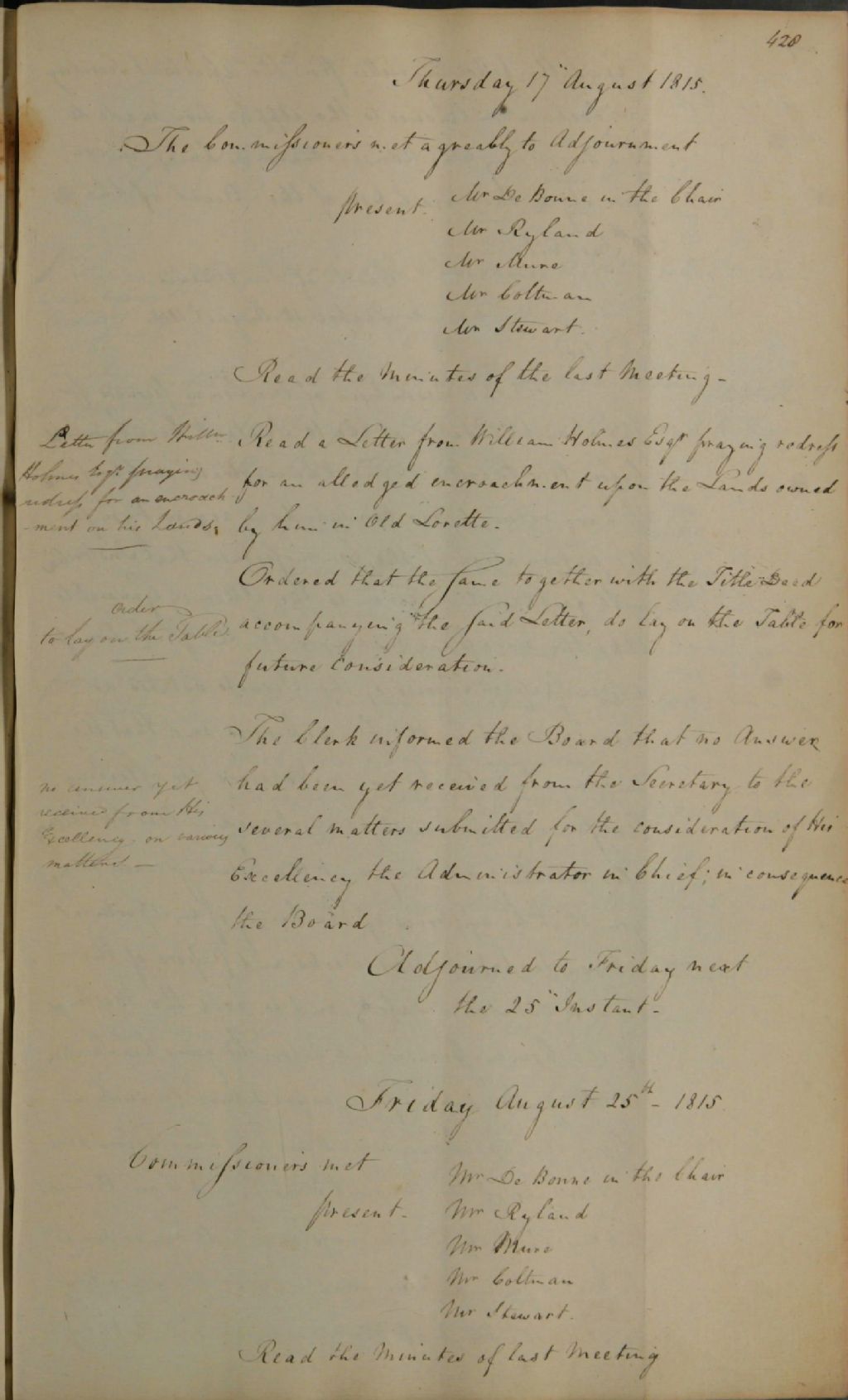 Procès-verbal d'une réunion de la commission responsable de l'administration des biens des Jésuites, au sujet d'une requête de William Holmes, se plaignant d'empiètements sur ses terres, qui sont situées dans Old Lorette (L'Ancienne-Lorette)