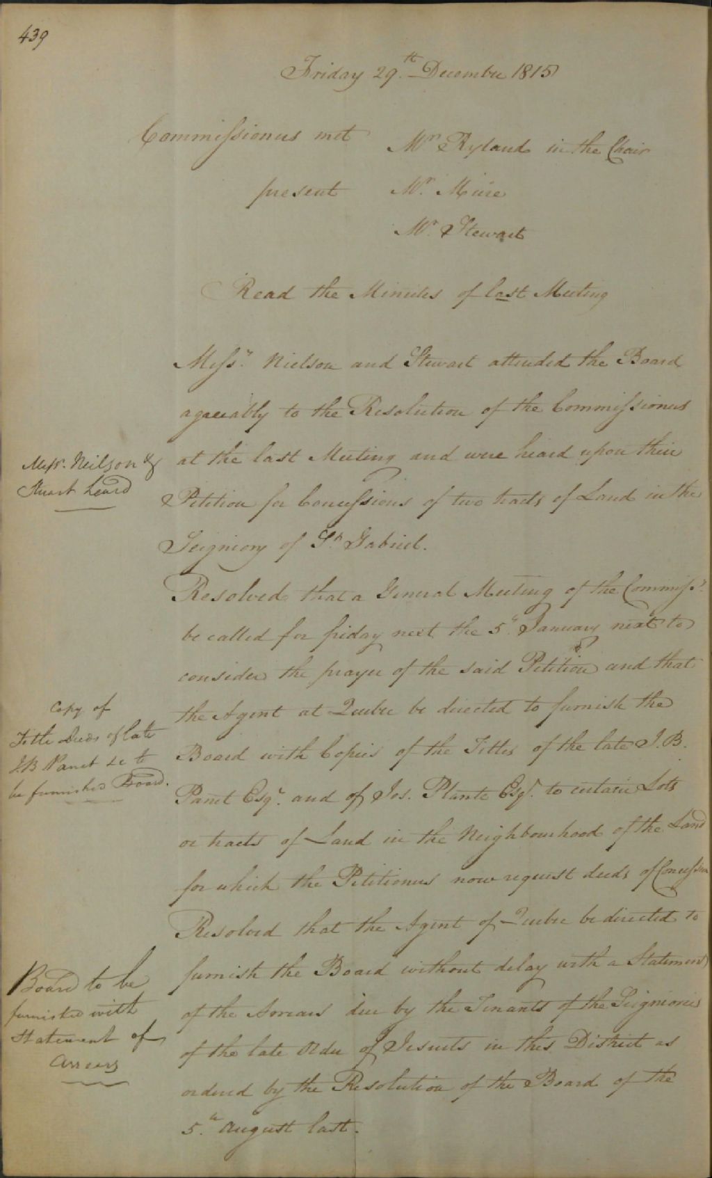 Procès-verbal d'une réunion de la commission responsable de l'administration des biens des Jésuites, au sujet de la requête de [John] Neilson et [Andrew] Stuart, pour obtenir des terres dans la seigneurie de Saint-Gabriel; au sujet de la réclamation par ladite commisson d'un état des arrérages à son agent du district de Québec (Michel Berthelot); au sujet de l'amélioration du papier-terrier des biens des Jésuites du district de Québec; au sujet de concessions faites par les Jésuites à [David] Monro et [Mathew] Bell et où il est ordonné à l'agent responsable des biens des Jésuites pour le district de Trois-Rivières (Joseph Badeaux) de n'accepter aucune rente de la part de [Thomas] Coffin pour les concessions que ce dernier a reçues du Père Casot (Jean-Joseph Casot), 29 décembre 1815, Archives nationales à Québec, Fonds Ministère des Terres et Forêts, (03Q,E21,S64,SS5,SSS2,D690-200).