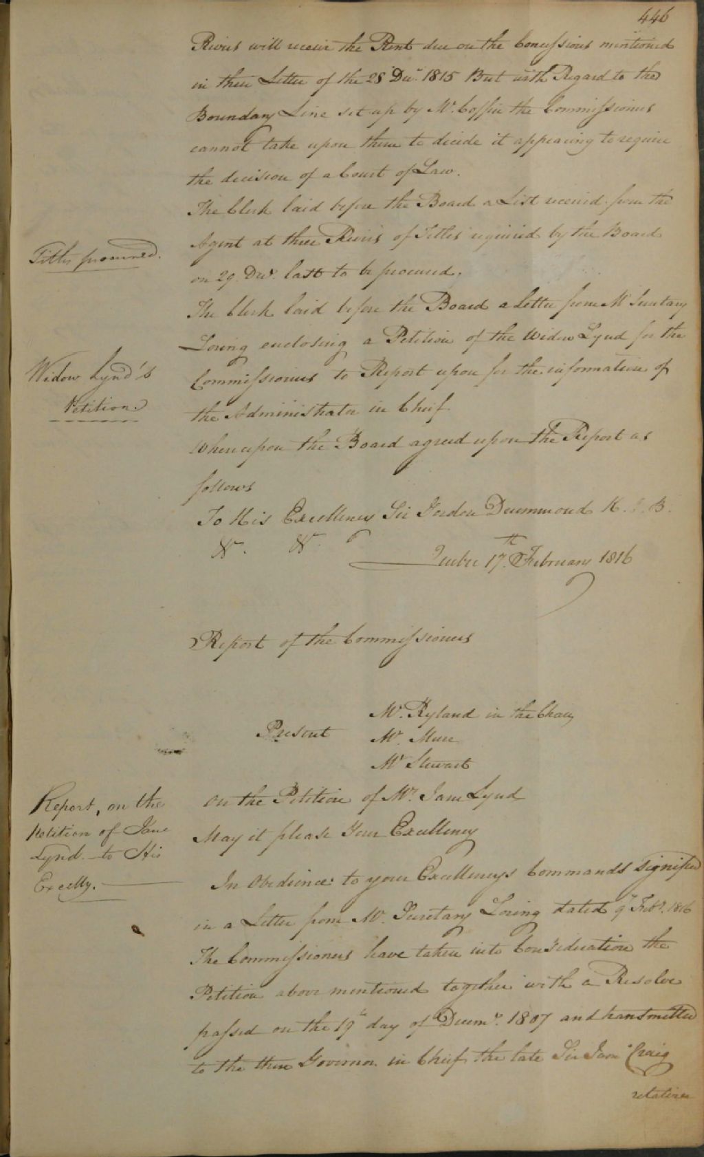 Procès-verbal d'une réunion de la commission responsable de l'administration des biens des Jésuites, au sujet d'une requête de Jane Lynd (Henry); au sujet d'une requête de Short Carter, réclamant des concessions sur la rivière Saint-Maurice; au sujet du loyer de ladite commission; au sujet d'une lettre de [Charles Richard] Ogden, où ce dernier indique qu'il accepte le poste de solliciteur pour ladite commission pour le district de Trois-Rivières, 18 février 1816 - 7 mars 1816, Archives nationales à Québec, Fonds Ministère des Terres et Forêts, (03Q,E21,S64,SS5,SSS2,D690-204).