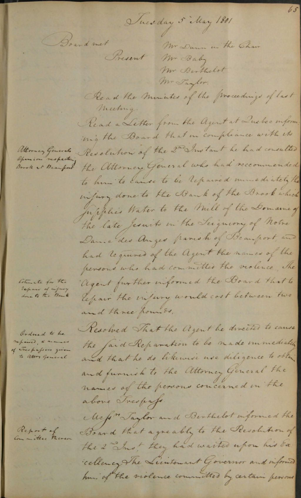 Procès-verbal d'une réunion de la commission responsable de l'administration des biens des Jésuites, au sujet du détournement des eaux d'un ruisseau alimentant le moulin de Beauport (moulin de la seigneuie de Notre-Dame-des-Anges) par les gens de la distillerie de Beauport, 5 mai 1801, Archives nationales à Québec, Fonds Ministère des Terres et Forêts, (03Q,E21,S64,SS5,SSS2,D690-25).