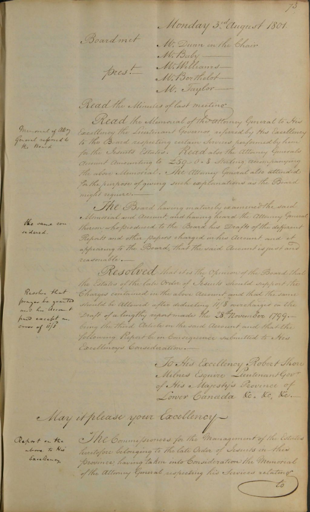 Procès-verbal d'une réunion de la commission responsable de l'administration des biens des Jésuites, au sujet des frais encourus par le procureur général (Jonathan Sewell) pour services professionnels rendus et au sujet des réparations à réaliser sur le moulin de Indian Lorette (Indian-Lorette; Jeune-Lorette), 3 août 1801, Archives nationales à Québec, Fonds Ministère des Terres et Forêts, (03Q,E21,S64,SS5,SSS2,D690-29).