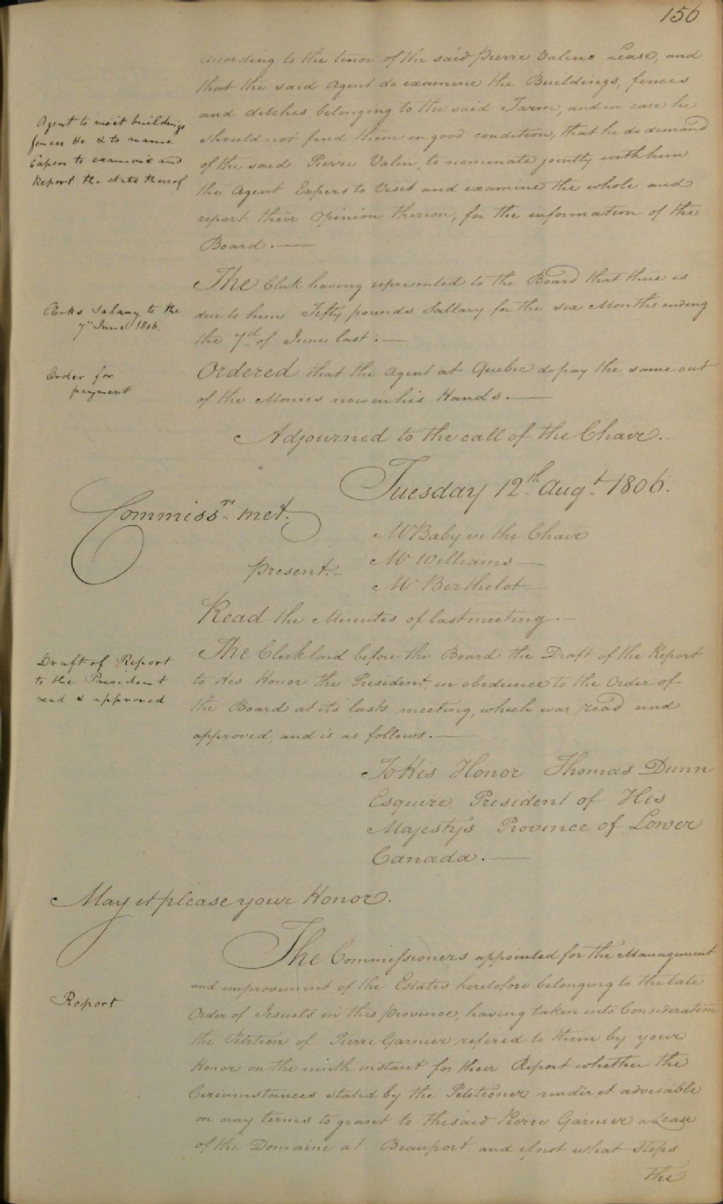 - Les commissaires préparent un rapport, où ils présentent au président de la province, Thomas Dunn, leur décision à propos de P. Garnier, qui avait obtenu, aux enchères, le bail du domaine de Beauport (voir le dossier E21,S64,SS5,SSS2,D690-90)