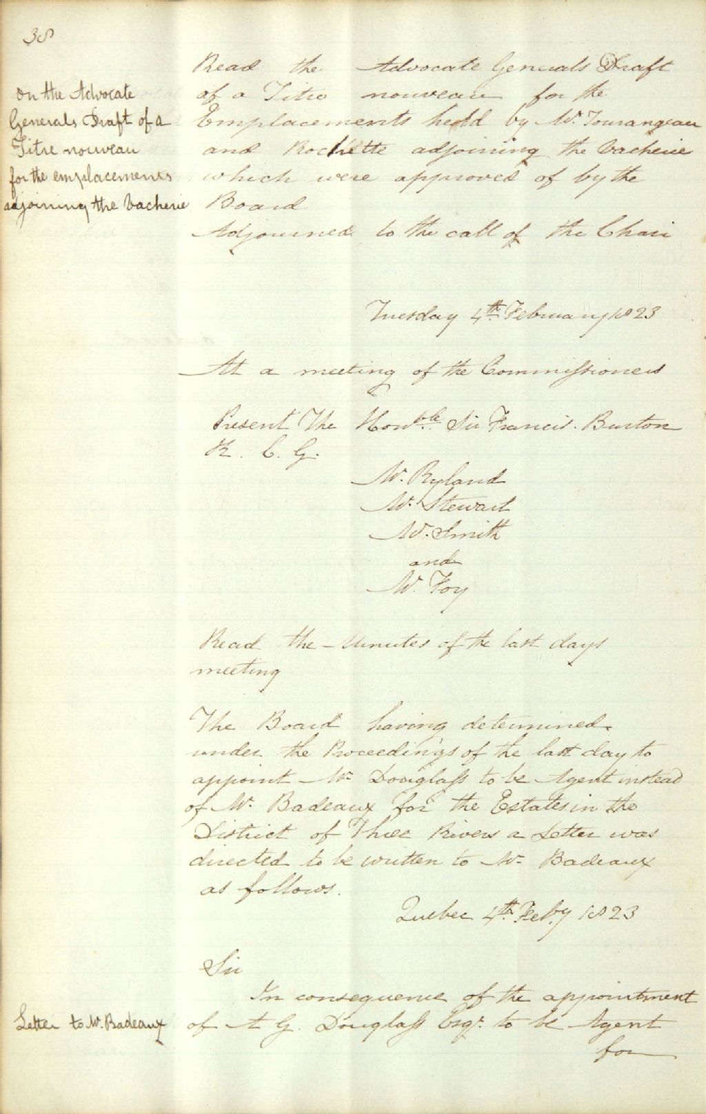 Procès-verbal d'une réunion de la commission responsable de l'administration des biens des Jésuites : 1) au sujet de la nomination du capitaine Antoine Gilbert Douglas comme agent des biens des Jésuites pour le district des Trois-Rivières au lieu et place de Joseph Badeaux ; 2) au sujet des représentations de Lewis Foy qui est autorisé à louer la maison présentement occupée comme office pour la Commission ; et 3) au sujet du paiement du compte de papeterie de Thomas Cary, 4 février 1823, Archives nationales à Québec, Fonds Ministère des Terres et Forêts, (03Q,E21,S64,SS5,SSS2,D693-12).