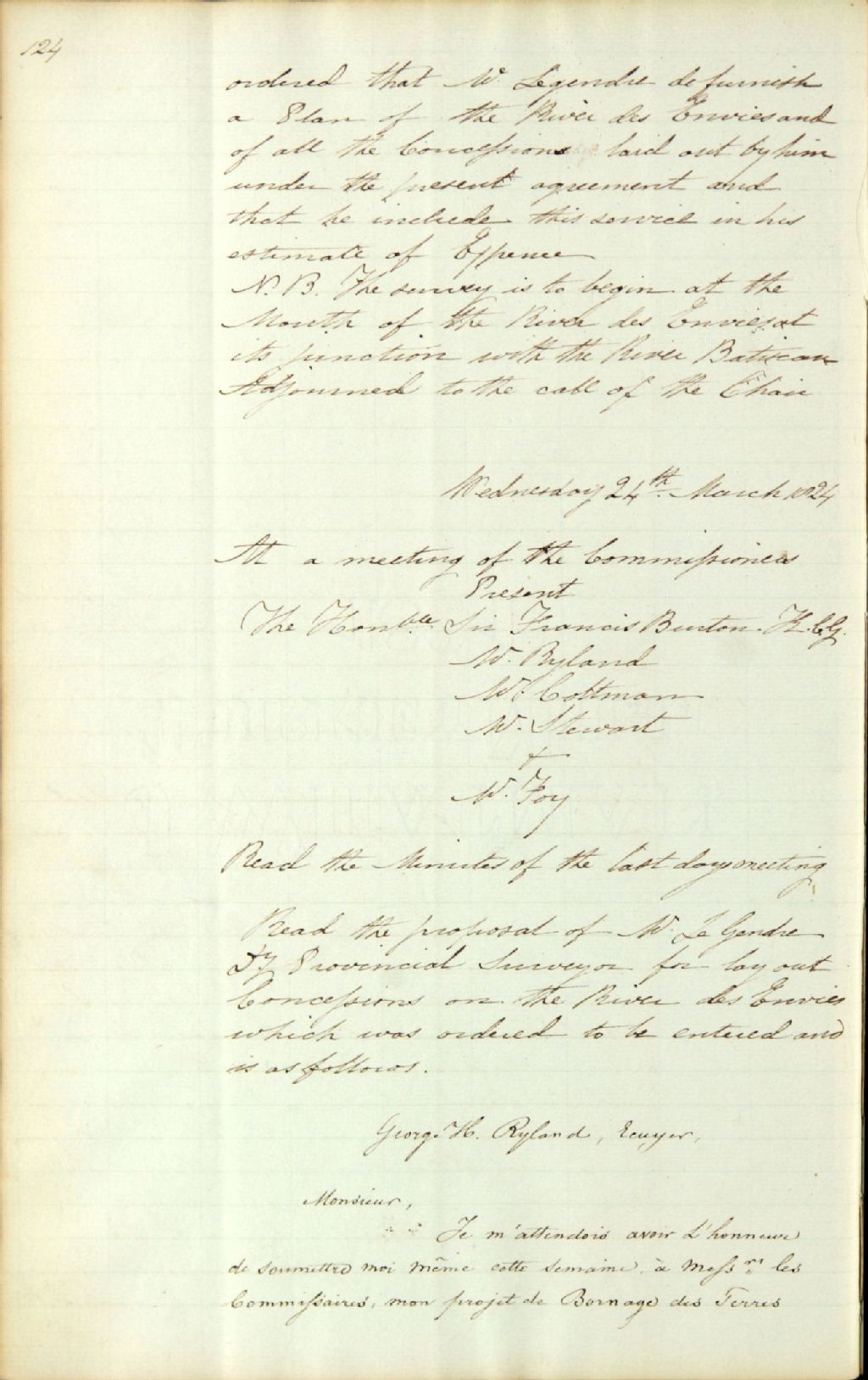 Procès-verbal d'une réunion de la commission responsable de l'administration des biens des Jésuites ; 1) au sujet d'une lettre de Louis Legendre, arpenteur provincial, en date du 7 mars 1824, soumettant des propositions pour un projet de bornage des terres de la seigneurie de Batiscan, paroisse de Saint-Stanislas sur la rivière des Envies ; 2) au sujet d'une lettre à faire parvenir à Andrew William Cochran, secrétaire du gouverneur, pour obtenir les lettres patentes nécessaires à la formation d'un papier-terrier de la seigneurie de Batiscan dans le district des Trois-Rivières ; et 3) au sujet d'une lettre de Peter Patterson, en date du 24 mars 1824, désirant la construction d'un quai sur la grève de Sillery