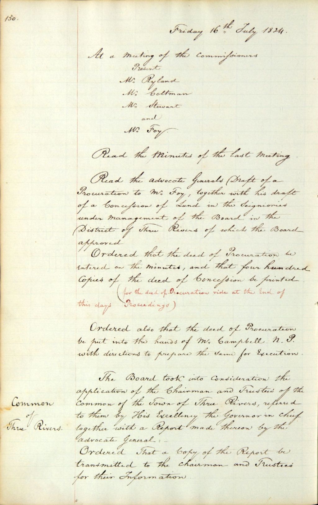 Procès-verbal d'une réunion de la commission responsable de l'administration des biens des Jésuites ; 1) au sujet du dépôt devant la Commission d'une copie effectué par l'Avocat général d'un acte de procuration de la Commission des biens des Jésuites en faveur de Lewis Foy et de 400 copies d'actes de concessions pour les seigneuries du district de Trois-Rivières ; 2) au sujet d'une requête du président et des syndics de la commune de la ville des Trois-Rivières ; et 3) au sujet d'un avertissement publié dans la Quebec Gazette (Gazette de Québec), en date du 19 avril 1824, concernant la saisie des terres de John Craigie dans la seigneurie de Batiscan, et d'une lettre à faire parvenir à Augustin D. Bostwick pour le suivi de cette cause tel qu'il appert suivant les instructions qu'il a déjà reçu le 12 février dernier, 16 juillet 1824, Archives nationales à Québec, Fonds Ministère des Terres et Forêts, (03Q,E21,S64,SS5,SSS2,D693-58).