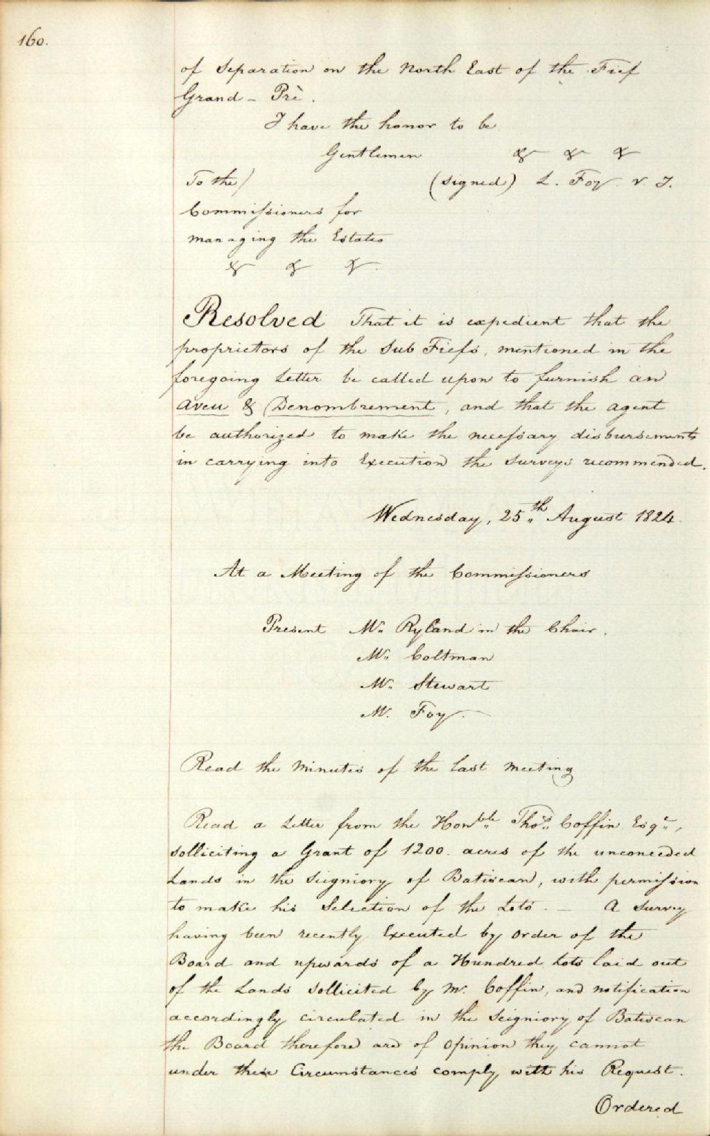 Procès-verbal d'une réunion de la commission responsable de l'administration des biens des Jésuites ; au sujet d'une lettre de Thomas Coffin, réclamant un octroi de 1200 acres de terres non concédées dans la seigneurie de Batiscan, 25 août 1824, Archives nationales à Québec, Fonds Ministère des Terres et Forêts, (03Q,E21,S64,SS5,SSS2,D693-61).