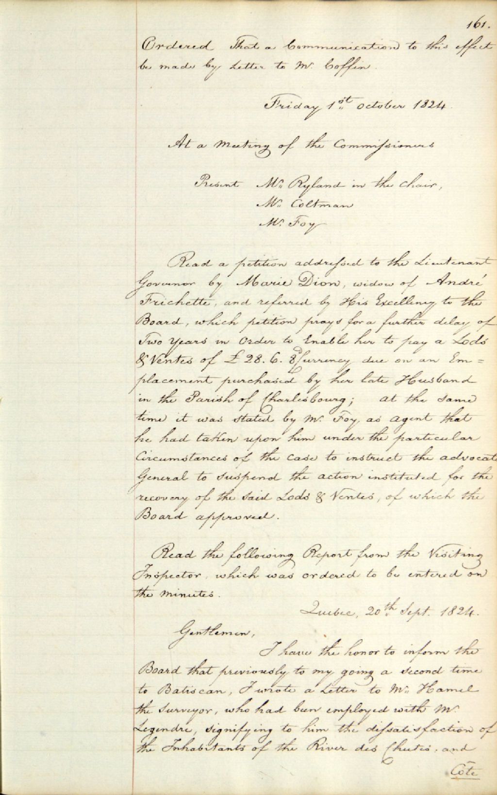 Procès-verbal d'une réunion de la commission responsable de l'administration des biens des Jésuites ; 1) au sujet d'une pétition adressée par Marie Dion, veuve de André Fréchette, demandant un délai de deux ans pour payer des lods et ventes dûs sur un emplacement situé dans la paroisse de Charlesbourg ; et 2) au sujet d'un rapport de Lewis Foy, inspecteur visiteur des biens des Jésuites, en date du 20 septembre 1824, sur une deuxième visite d'inspection qu'il effectua à Batiscan où il signale l'insatisfaction des habitants de la rivière des Chutes et de la côte Saint-Stanislas à propos des récents travaux d'arpentage