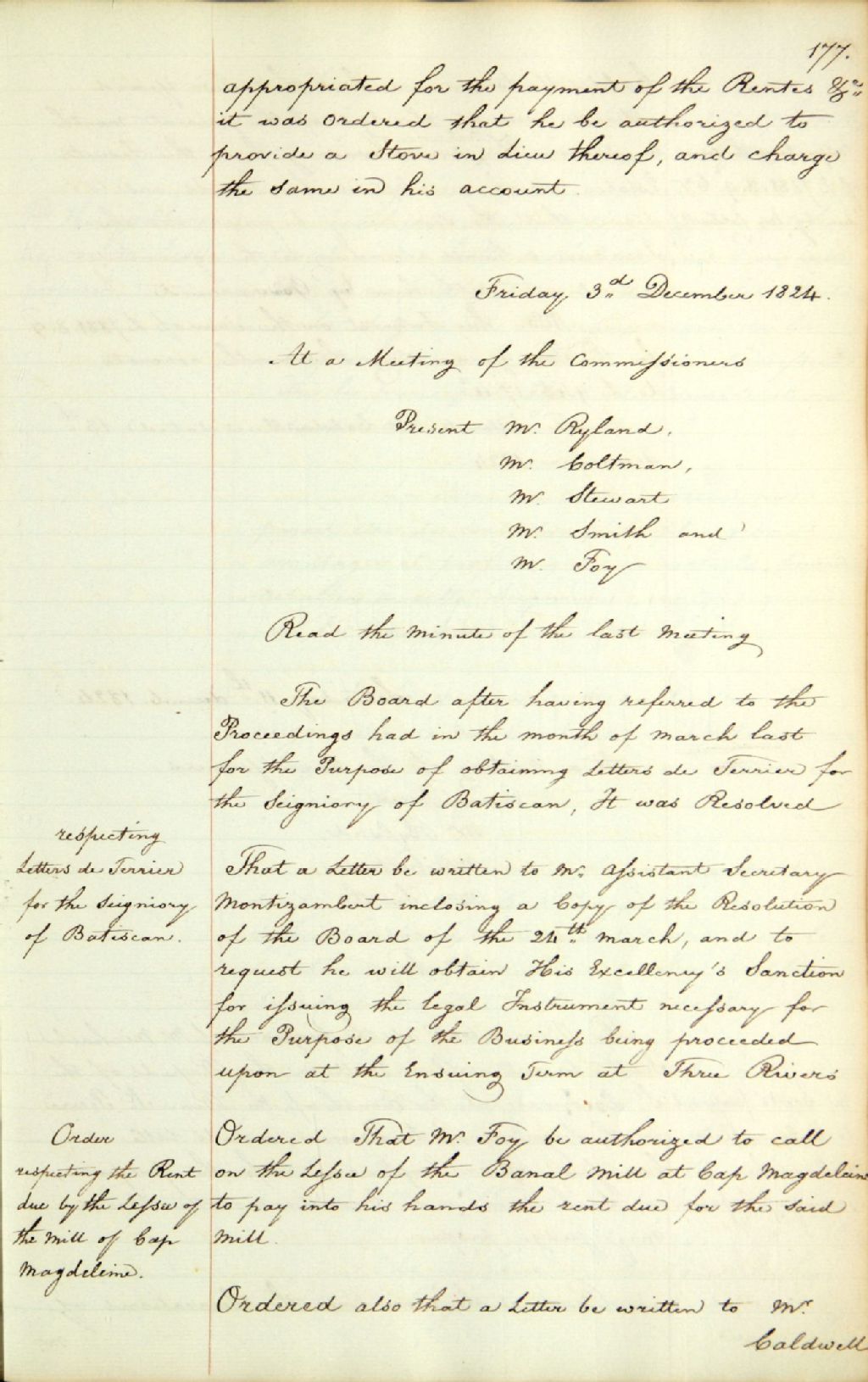 Procès-verbaux d'une réunion de la commission responsable de l'administration des biens des Jésuites ; 1) au sujet de l'obtention de lettres patentes pour le terrier de la seigneurie de Batiscan ; 2) au sujet de l'autorisation donnée à Lewis Foy de percevoir les arrérages dues sur le moulin banal du Cap-de-la-Madeleine ; et 3) au sujet d'une lettre à faire parvenir à John Caldwell lui rappelant le paiement de deux années d'intérêt sur une somme d'argent qu'il doit, 3 décembre 1824, Archives nationales à Québec, Fonds Ministère des Terres et Forêts, (03Q,E21,S64,SS5,SSS2,D693-66).