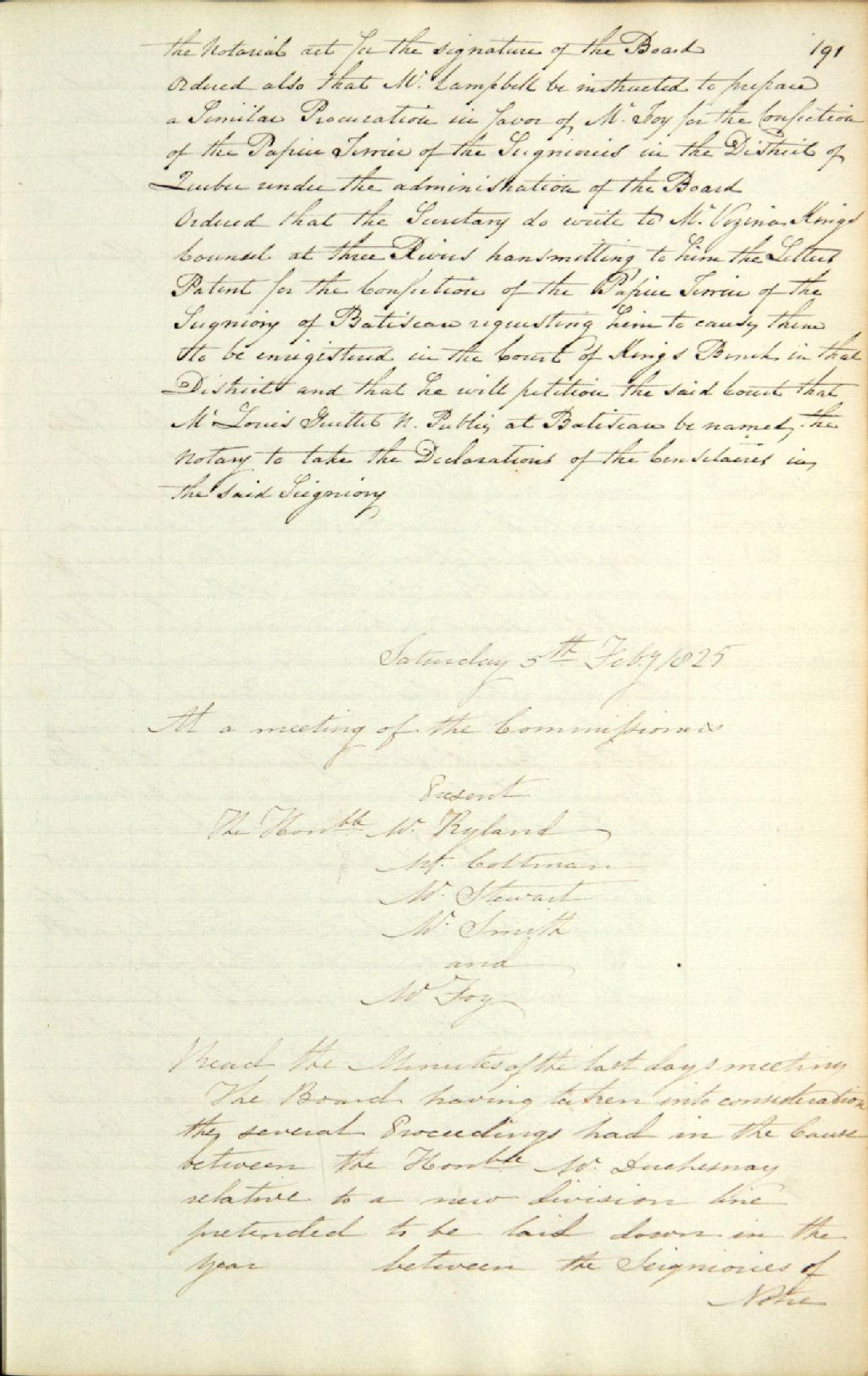 Procès-verbal d'une réunion de la commission responsable de l'administration des biens des Jésuites ; 1) au sujet des démarches effectuées dans la cause contre Antoine-Louis Juchereau Duchesnay, seigneur de Beauport, concernant la ligne de séparation des seigneuries de Notre-Dame-des-Anges et de Beauport ; et 2) au sujet d'une lettte de John Anderson, qui offre à la Commission de poursuivre le bail de sa maison, 5 février 1825, Archives nationales à Québec, Fonds Ministère des Terres et Forêts, (03Q,E21,S64,SS5,SSS2,D693-71).