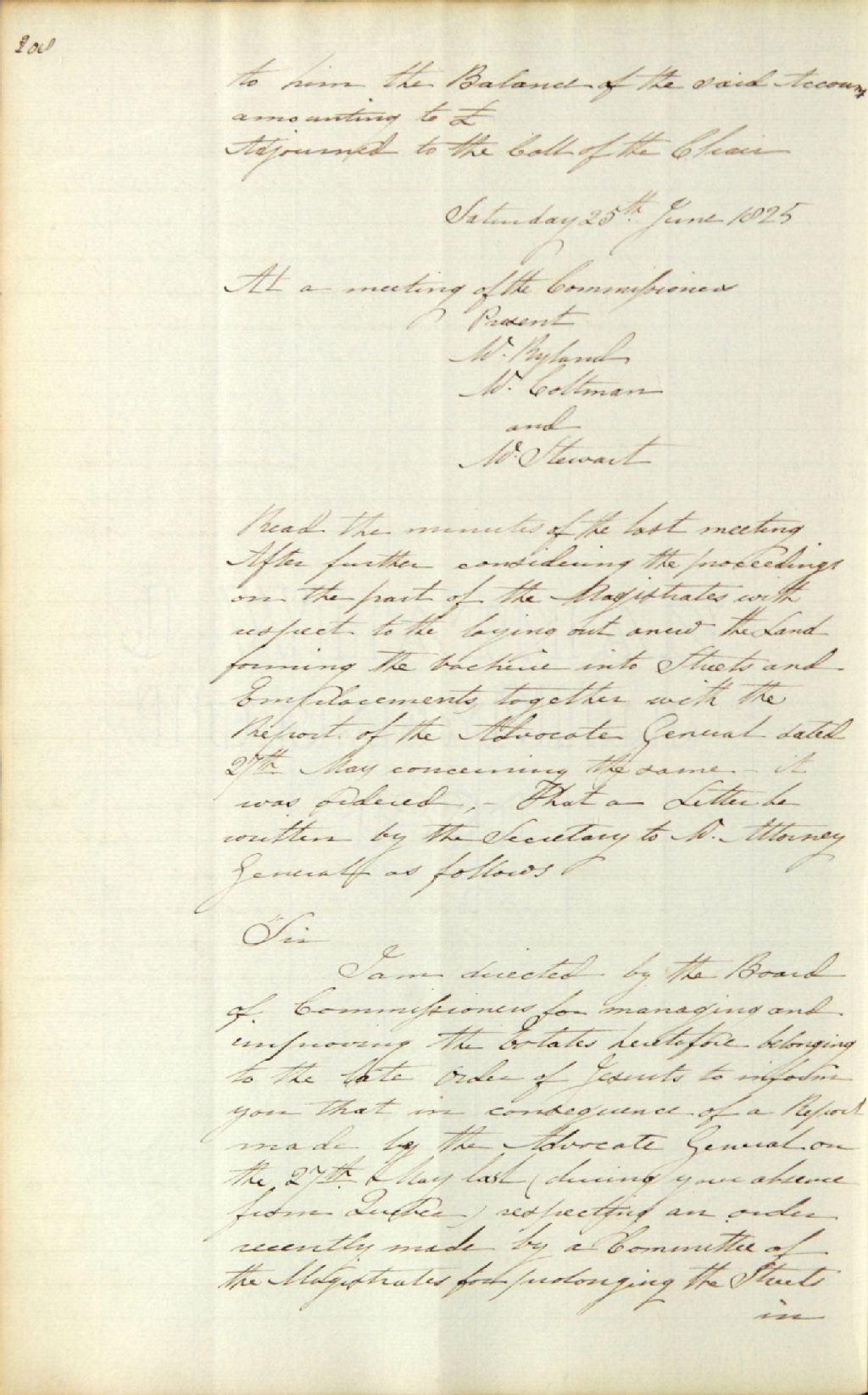 Procès-verbal d'une réunion de la commission responsable de l'administration des biens des Jésuites ; au sujet d'un rapport de George Vanfelson, avocat général, sur les procédures entreprises par les magistrats de Québec sur l'aménagement de rues et d'emplacements dans la ferme nommée la Vacherie, et d'une lettre à faire parvenir à James Stuart, procureur général, pour supporter les droits de la Couronne sur cette propriété, 25 juin 1825, Archives nationales à Québec, Fonds Ministère des Terres et Forêts, (03Q,E21,S64,SS5,SSS2,D693-77).
