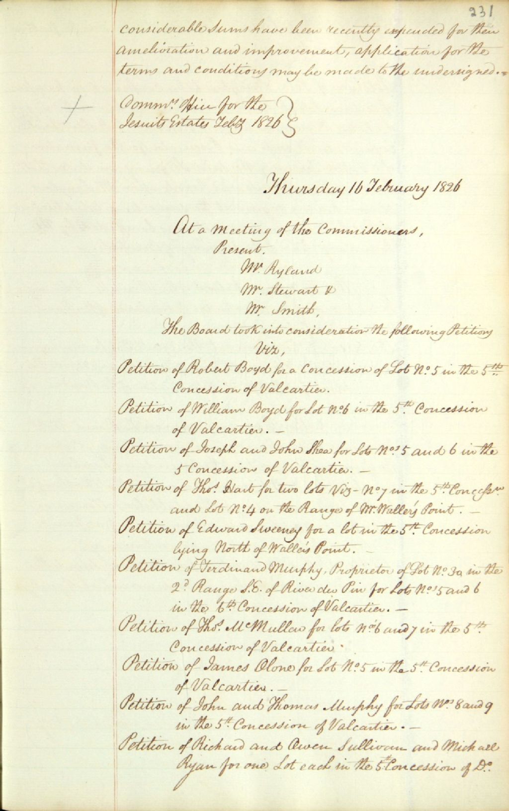 Procès-verbal d'une réunion de la commission responsable de l'administration des biens des Jésuites ; 1) au sujet de diverses pétitions pour obtenir des concessions de terre à Valcartier ; 2) au sujet d'une pétition de Peter Langlois réclamant la possession de certains lots de terre dans la seigneurie de Notre-Dame-des-Anges ; 3) au sujet de représentations effectuées par Alexander Craig, locataire du moulin banal de Charlesbourg ; et 4) au sujet de la transcription des procès-verbaux de ladite commission, 16 février 1826, Archives nationales à Québec, Fonds Ministère des Terres et Forêts, (03Q,E21,S64,SS5,SSS2,D693-88).