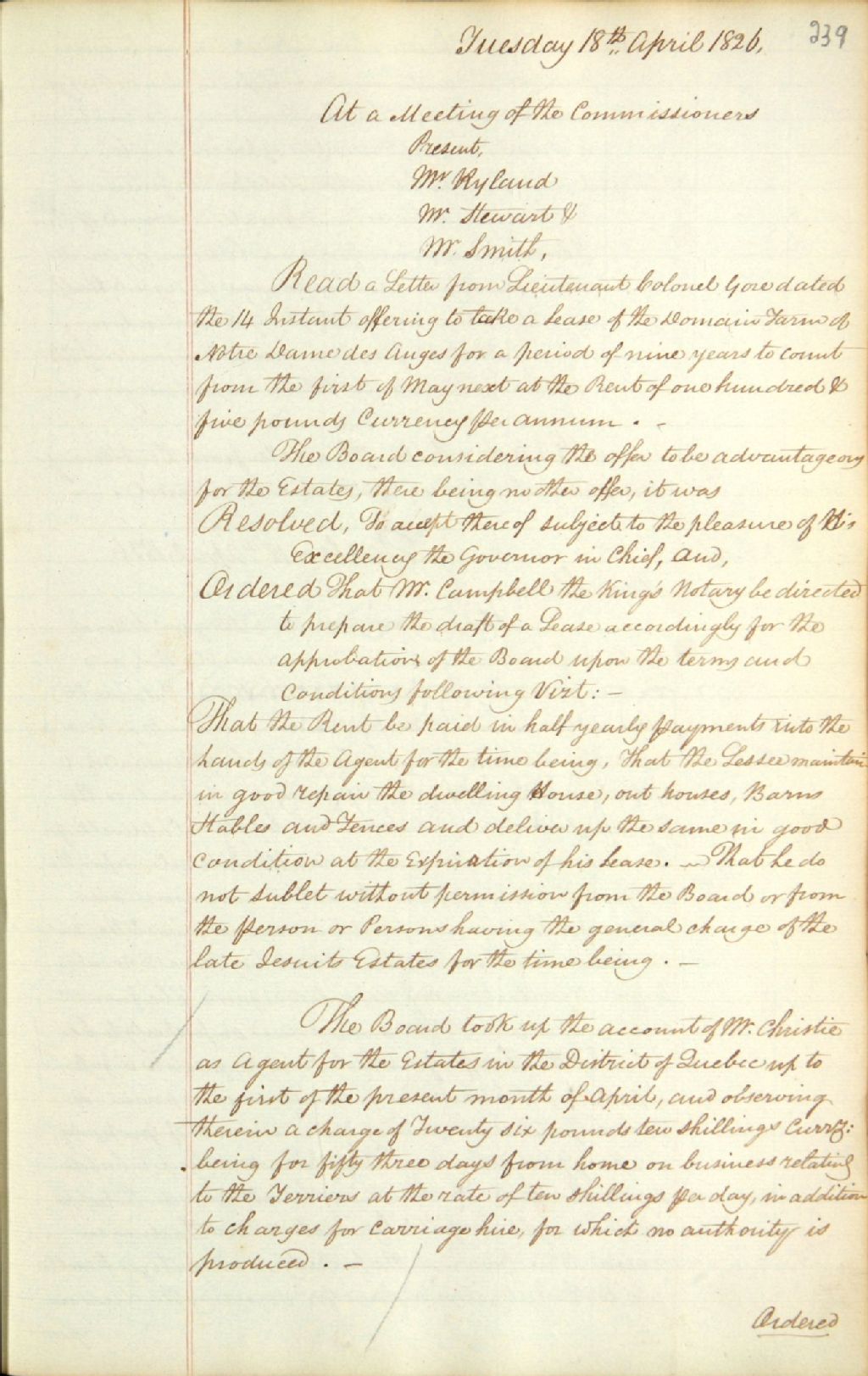 Procès-verbal d'une réunion de la commission responsable de l'administration des biens des Jésuites ; 1) au sujet d'une lettre du lieutenant-colonel Ralph Gore, en date du 14 avril 1826, de prendre le bail de la ferme du domaine de Notre-Dame-des-Anges ; 2) au sujet de l'examen des états de compte de Robert Christie, agent des biens des Jésuites pour le district de Québec, pour la période se terminant au 1er avril 1826 ; et 3) au sujet d'une lettre de James Stuart, procureur général, en date du 18 avril 1826, concernant les procédures à prendre pour récupérer les sommes d'argent dues par John Caldwell, de la gestion de Henry Caldwell, trésorier des biens des Jésuites