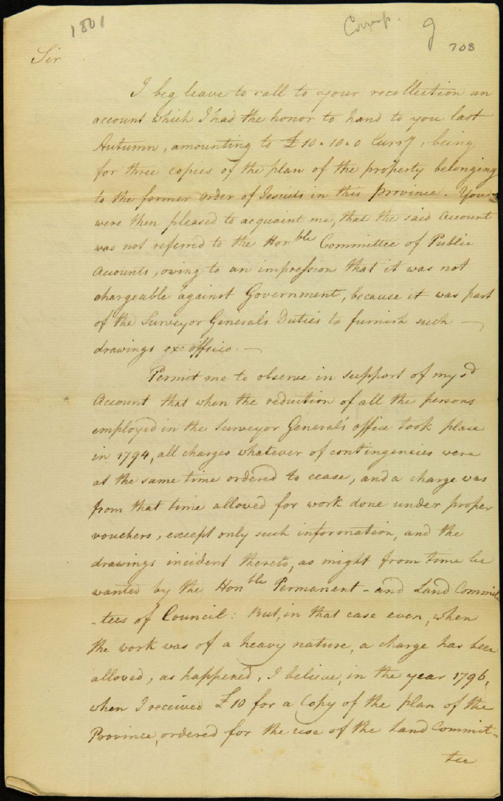 Lettre de William Vondenvelden, qui agit à titre d'assistant de l'arpenteur général depuis six ans, à Herman Witsius Ryland [secrétaire civil du gouverneur] à propos d'un compte relatif à trois copies du plan des propriétés relevant des biens des Jésuites, 17 novembre 1801, Archives nationales à Québec, Fonds Ministère des Terres et Forêts, (03Q,E21,S64,SS5,SSS2,D708).