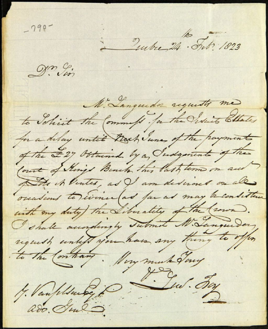 Lettre envoyée par Lewis [Louis] Foy à G. [George] Vanfelson, avocat général, au sujet de la requête de monsieur Languedoc qui a sollicité un délai de paiement auprès de la Commission des biens des Jésuites à la suite du jugement rendu par la Cour du Banc du Roi l'obligeant à verser, au mois de juin, 27 livres pour lods et ventes, 24 février 1823, Archives nationales à Québec, Fonds Ministère des Terres et Forêts, (03Q,E21,S64,SS5,SSS2,D790).