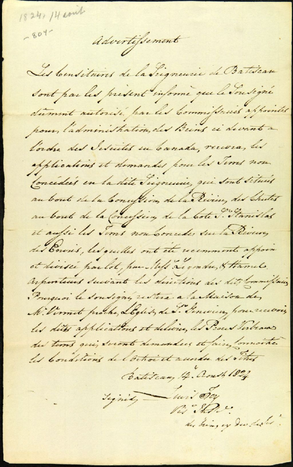 Avertissement lu aux portes de l'église de Sainte-Geneviève, dans la seigneurie de Batiscan, pour aviser les censitaires que Lewis [Louis] Foy, inspecteur visiteur dûment autorisé par les commissaires appointés pour l'administration des biens des Jésuites, recevra les applications et les demandes pour les terres non concédées dans ladite seigneurie qui sont situées au bout de la concession de la rivière des Chutes et au bout de la concession de la côte Saint-Stanislas et, également, les terres non concédées sur la rivière des Envies, lesquelles ont été divisées en lots par messieurs Legendre et Hamel, arpenteurs. Le soussigné restera à la maison de monsieur Vermet, proche de l'église de Sainte-Geneviève pour recevoir lesdites applications et délivrer les procès-verbaux des terres qui seront demandées, faire connaître les conditions de l'octroi et accorder les titres, 14 août 1824, Archives nationales à Québec, Fonds Ministère des Terres et Forêts, (03Q,E21,S64,SS5,SSS2,D804).