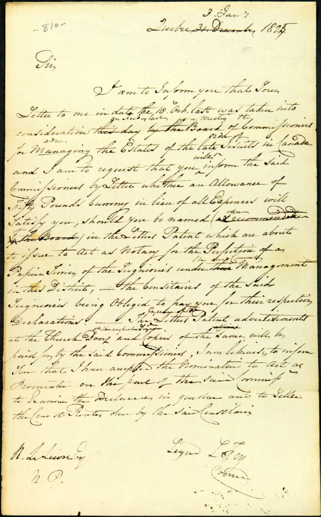 Brouillon d'une lettre de Lewis [Louis] Foy adressée à monsieur [Roger] Lelièvre, notaire public; en réponse à sa lettre du 18 octobre, les commissaires de l'administration des biens des Jésuites lui accordent une allocation pour la confection du papier terrier des seigneuries des Jésuites. On y apprend que les censitaires desdites seigneuries devront payer le notaire pour leurs déclarations respectives et qu'un avertissement a été affiché aux portes des églises. En outre, monsieur Foy a accepté sa nomination comme procurateur et il agira au nom de ladite Commission dans la confection du papier terrier, et ce, en examinant les déclarations en question et en collectant les cens et rentes dus par lesdits censitaires, 3 janvier 1825, Archives nationales à Québec, Fonds Ministère des Terres et Forêts, (03Q,E21,S64,SS5,SSS2,D810).