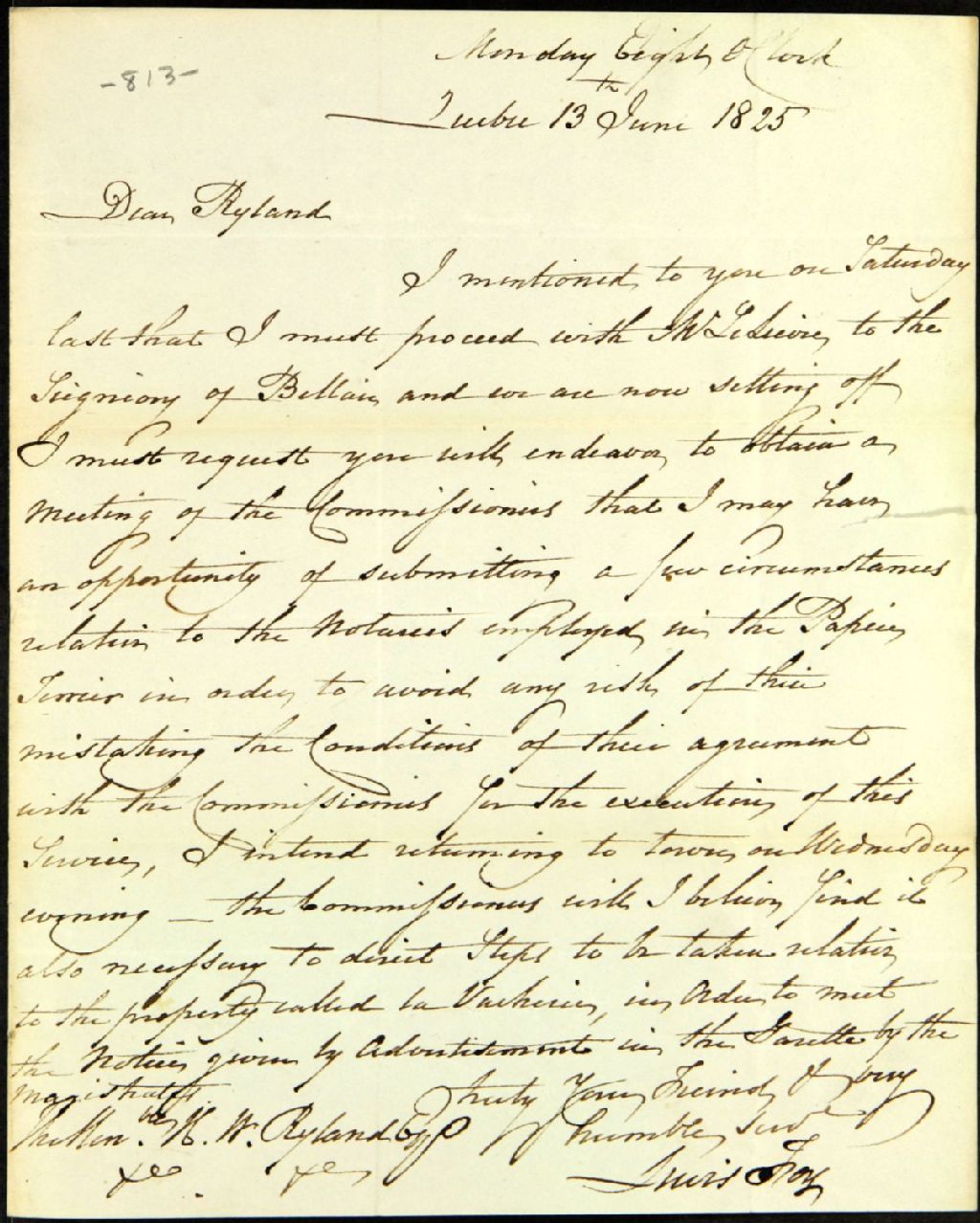 Lettre de Louis Foy adressée à H. W. [Herman Witsius] Ryland concernant la nécessité d'avoir une rencontre avec les commissaires relativement à la confection du papier terrier de la seigneurie de Bellair (Bélair). Par ailleurs, il veut s'assurer que les notaires qui travaillent à la confection des papiers terriers connaissent les exigences inhérentes à ce travail, 13 juin 1825, Archives nationales à Québec, Fonds Ministère des Terres et Forêts, (03Q,E21,S64,SS5,SSS2,D813).