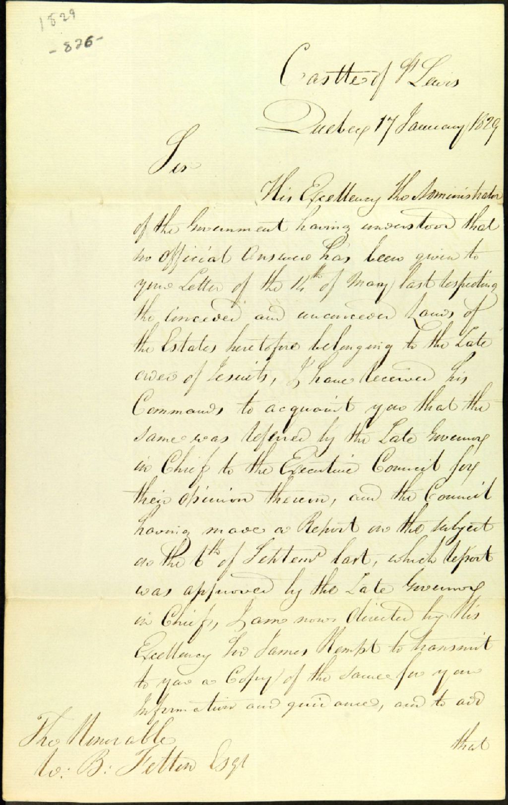 Lettre du lieutenant-colonel Yorke adressée à [William] B. [Bowman] Felton, secrétaire civil, qui lui envoie une copie du rapport du Conseil des biens des Jésuites en regard des terres concédées et non concédées appartenant autrefois aux Jésuites, 17 janvier 1829, Archives nationales à Québec, Fonds Ministère des Terres et Forêts, (03Q,E21,S64,SS5,SSS2,D826).