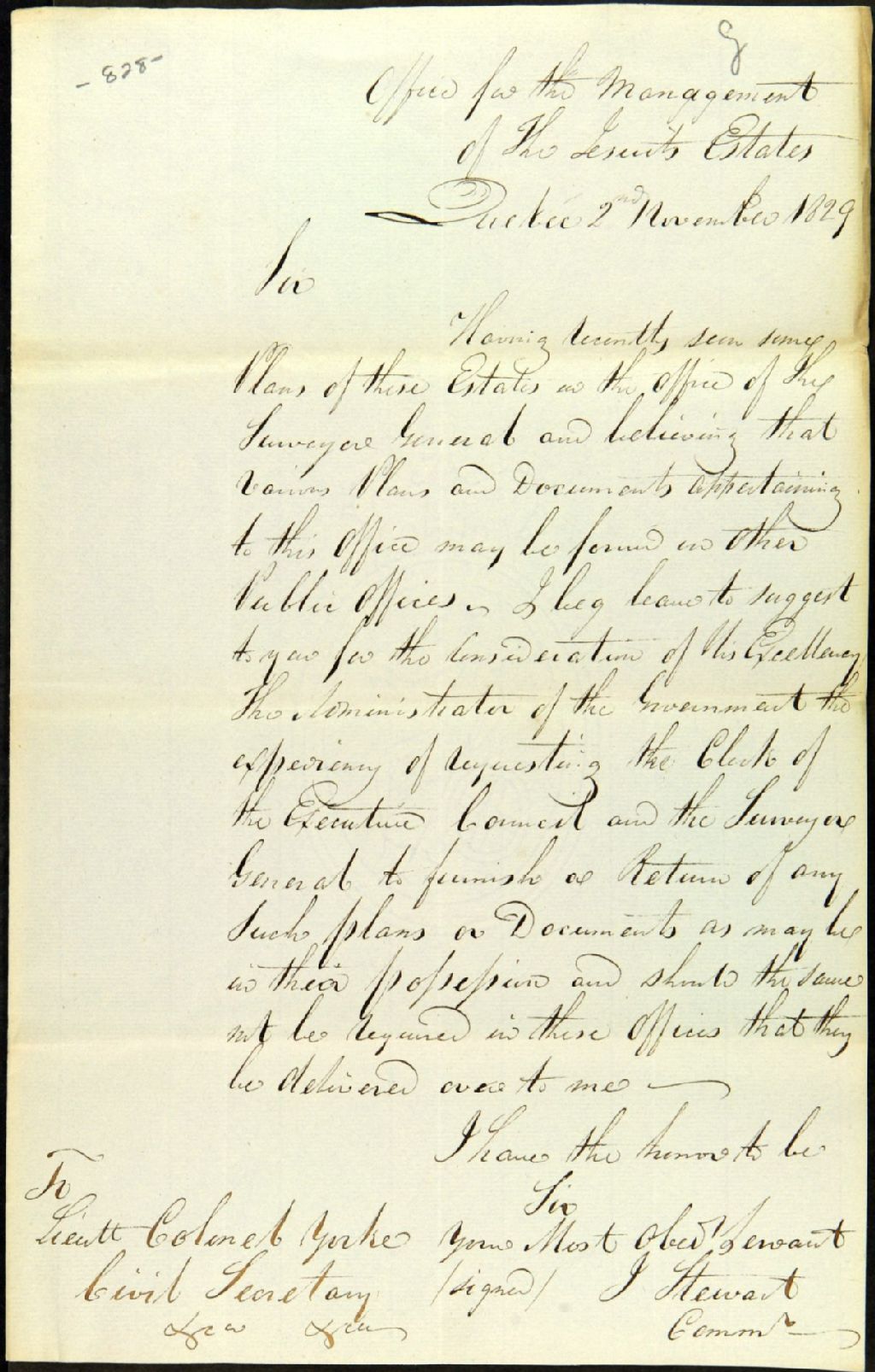 Lettre de J. Stewart, commissaire, adressée au lieutenant-colonel Yorke, secrétaire civil; au sujet des plans d'arpentage relatifs aux biens des Jésuites. Stewart mentionne qu'il n'a pas tous les plans de l'arpenteur général à son bureau et que d'autres plans pourraient être trouvés dans d'autres bureaux publics. Il suggère donc que l'on demande au secrétaire du Conseil exécutif et à l'arpenteur général de fournir et retourner tous les plans et documents qui pourraient être en leur possession, 2 novembre 1829, Archives nationales à Québec, Fonds Ministère des Terres et Forêts, (03Q,E21,S64,SS5,SSS2,D828).