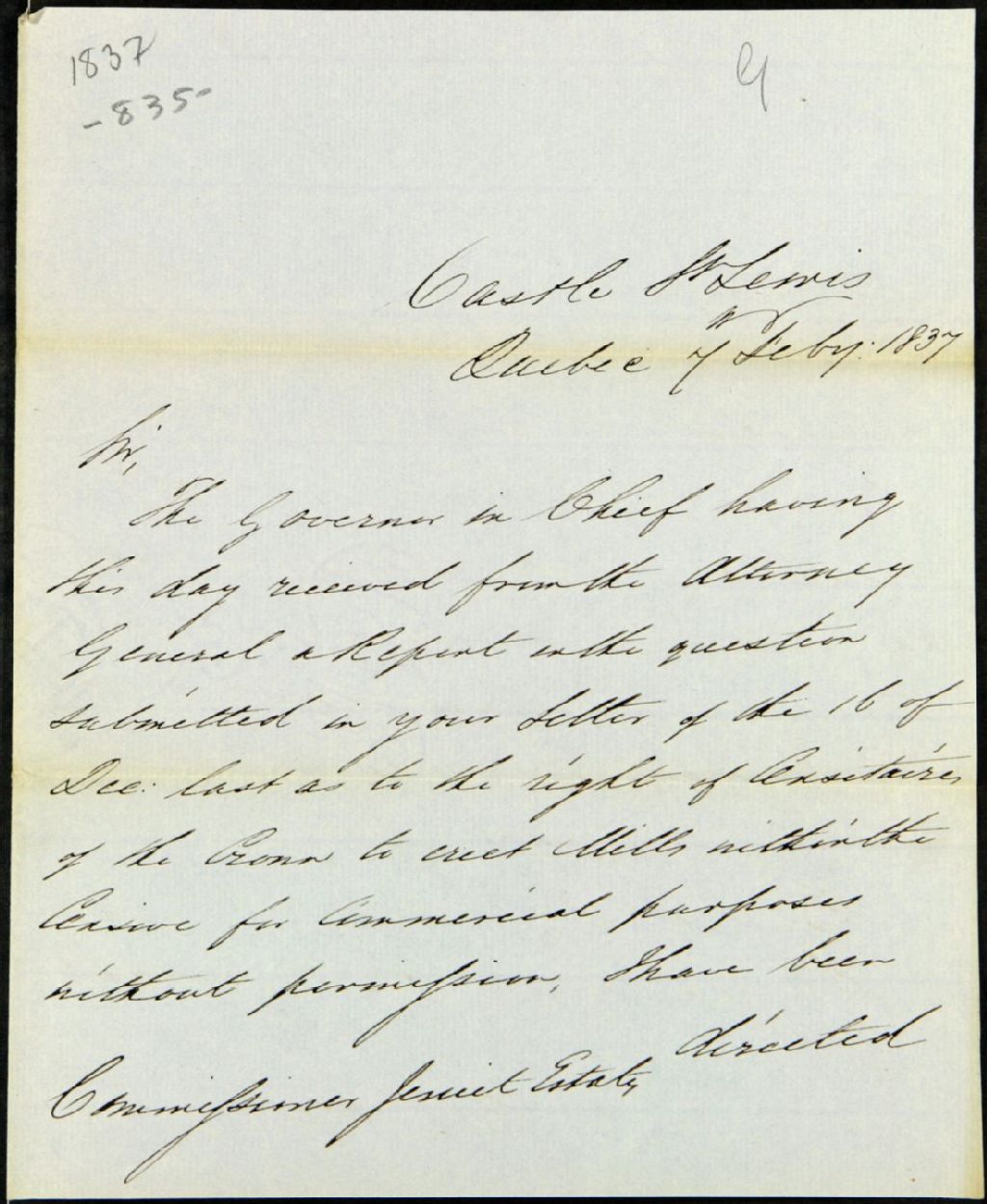 Lettre de monsieur Walcott, secrétaire civil, adressée aux commissaires des biens des Jésuites à propos de la question qu'ils ont soumise relativement aux droits des censitaires de la Couronne d'ériger, à l'intérieur de la censive, et ce, sans permission, des moulins dont les visées sont commerciales, 7 février 1837, Archives nationales à Québec, Fonds Ministère des Terres et Forêts, (03Q,E21,S64,SS5,SSS2,D835).