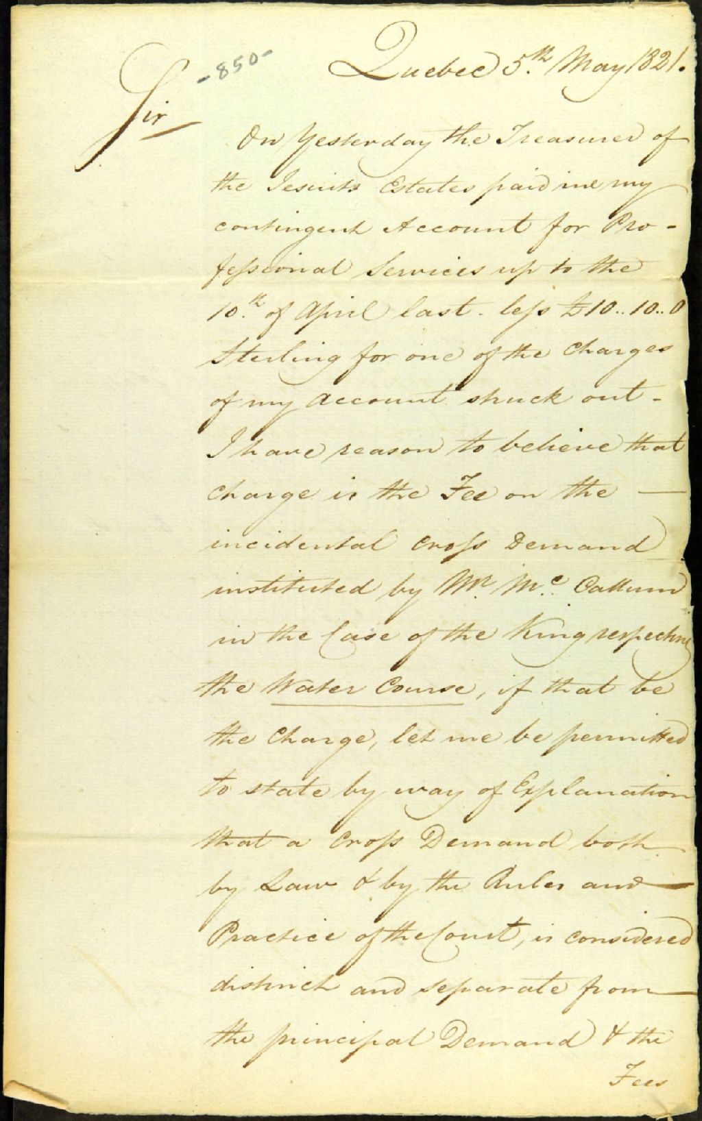 Lettre de G. [George] Vanfelson, avocat général, adressée à Lewis [Louis] Foy à propos du paiement de ses honoraires professionnels, 5 mai 1821, Archives nationales à Québec, Fonds Ministère des Terres et Forêts, (03Q,E21,S64,SS5,SSS2,D850).
