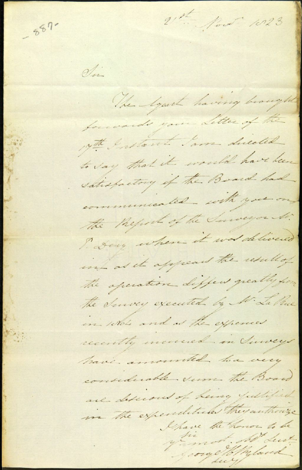 Lettre de George H. [Herman] Ryland adressée à [Michel] L. [Louis] Juchereau Duchesnay, [seigneur de Gaudarville et de Fossambault]; au sujet du rapport de l'arpenteur [Pierre] Déry qui diffère considérablement de l'arpentage exécuté par monsieur Larue en 1804 et, notamment, à propos des dépenses considérables encourues pour cet arpentage et pour lesquelles le Conseil désire obtenir une justification, lesdites dépenses devant être autorisées, 21 mars 1823, Archives nationales à Québec, Fonds Ministère des Terres et Forêts, (03Q,E21,S64,SS5,SSS2,D887).