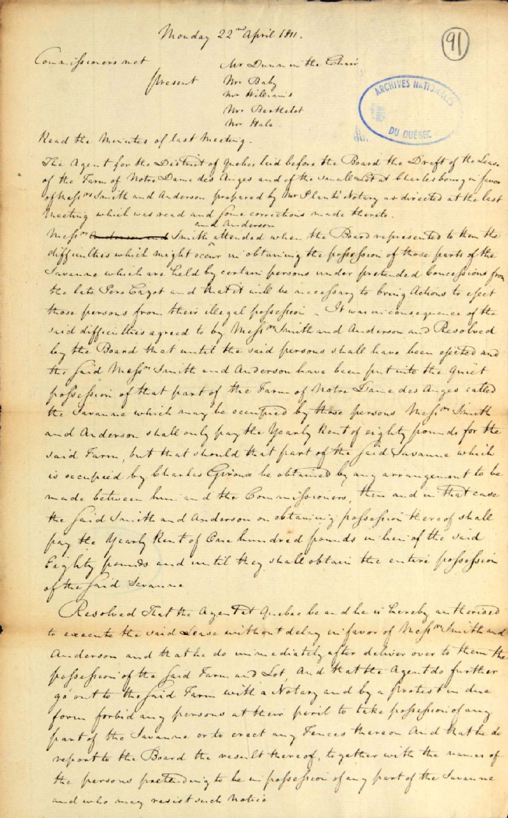 Brouillon d'un procès-verbal de la commission responsable de l'administration des biens des Jésuites, au sujet du brouillon de bail proposé par le notaire [Joseph-Bernard] Planté pour la ferme de Notre-Dame-des-Anges et d'un petit lot situé à Charlesbourg; au sujet des frais encourus par l'arpenteur général, [Joseph] Bouchette pour l'arpentage de ladite ferme (DBC), 22 avril 1811, Archives nationales à Québec, Fonds Ministère des Terres et Forêts, (03Q,E21,S64,SS5,SSS2,D91).