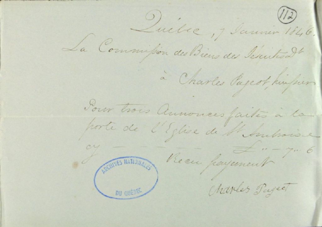 Reçu de Charles Pageot, huissier, à la Commission des biens des Jésuites, pour trois annonces faites à la porte de l'église de Saint-Ambroise, 7 janvier 1846, Archives nationales à Québec, Fonds Ministère des Terres et Forêts, (03Q,E21,S64,SS5,SSS3,D112).