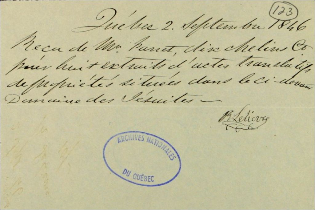 Reçu de Roger Lelièvre, notaire, à Louis Panet, agent des biens des Jésuites, pour huit extraits d'actes translatifs de propriétés situées dans le domaine des Jésuites, 2 septembre 1846, Archives nationales à Québec, Fonds Ministère des Terres et Forêts, (03Q,E21,S64,SS5,SSS3,D123).